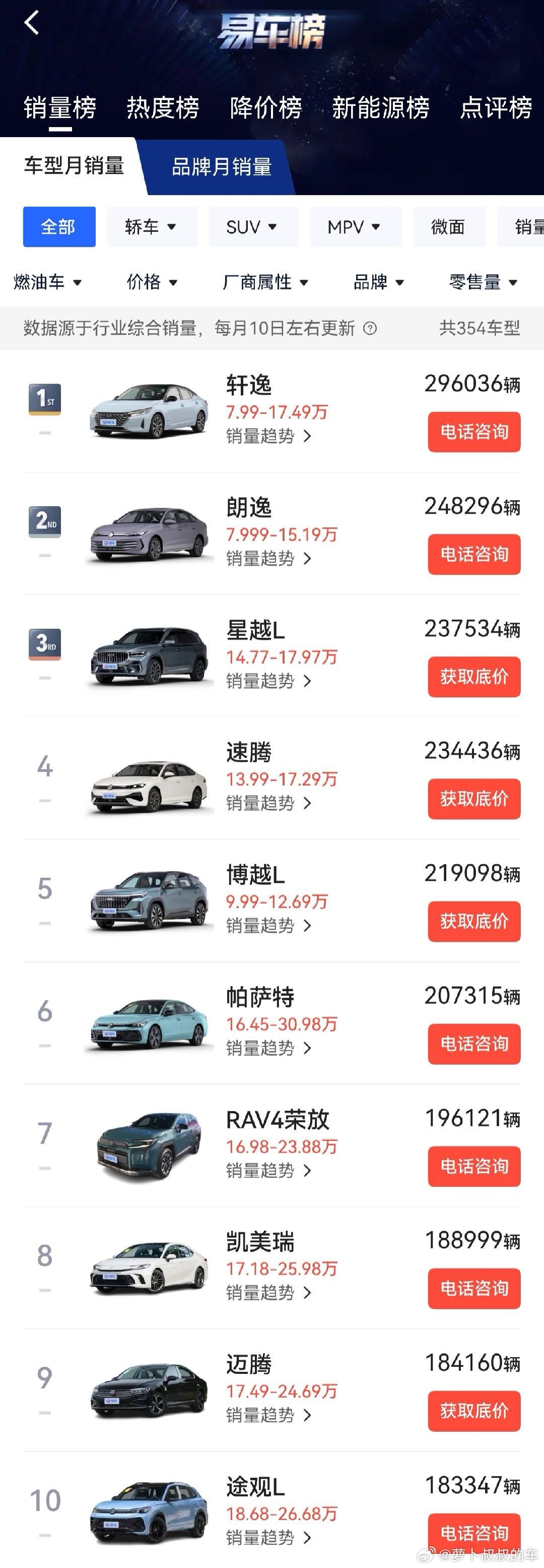 汽车销量榜,现在易车还在发布,这血淋淋的数据确实会让人感到焦虑,但现实就是现实,有差距就该继续努力。2025年1月至11月合计销量,南北丰田的销量正在逼近南北大众,双方的现场已经转移到本土化车型和新能源市场的竞争,2026年且看看双方新能源汽车的正面硬碰硬。车型零售销量总榜前十位,几乎是自主新能源车型的天下,轩逸和朗逸两代同堂的策略依旧能打,燃油车还是有市场的!燃油车零售销量榜依旧是合资车企的天下,销量前十中只有吉利两款车型,大众有5款车型上榜。合资燃油车销量遥遥领先 广州