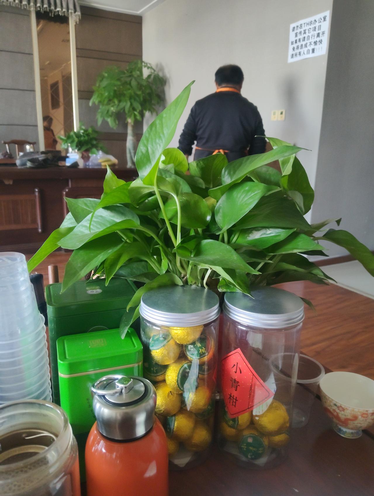 这办公室茶水角还挺接地气啊!桌上这两大罐小青柑一看就够喝一阵,配着绿萝看着还挺舒服。不过墙上那告示可真直白——“谢绝蹭茶”写得明明白白,估计是之前没少被薅羊毛?其实办公室里搞点共享茶歇挺好,但架不住总有人不自觉,最后只能把话说透。这种“先礼后兵”的规矩,虽然有点生硬,但也是没办法的办法,毕竟谁也不想自己的东西总被白拿不是?