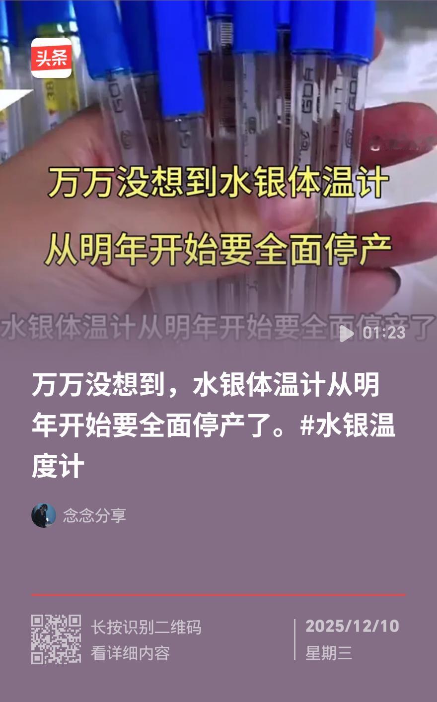 下月起全面禁产水银体温计!老物件退场只因这个隐患 注意!2026年1月1日起,国家将全面禁止生产含汞体温计和含汞血压计,这个几元一支、测温精准的老伙计,即将告别市场。 这次禁产并非凭空决定,而是为了履行《关于汞的水俣公约》。水银也就是汞,是剧毒重金属,一支标准水银体温计含1克汞。一旦打碎,汞蒸气会快速扩散,15平方米的房间内汞浓度会远超安全限值,短时间吸入就可能引发头晕、乏力等中毒症状,对人体和环境危害极大。 虽说水银体温计价格亲民、测量精准,但使用体验槽点不少。每次用前得使劲甩,老人小孩操作费劲,读数还得眯着眼瞅细小刻度,测温要等十分钟,远不如电子体温计、额温枪方便快捷。 目前市面上水银体温计已开始缺货,不过家里现有的还能继续用,只要妥善保管别打碎就行。医院早就普及了电子测温设备,精准度完全能替代水银体温计,既安全又省心。 这个禁令的背后,是对公众健康和生态环境的守护,也是对日本水俣病惨痛教训的铭记。水银温度计 医用水银体温计 传统体温计