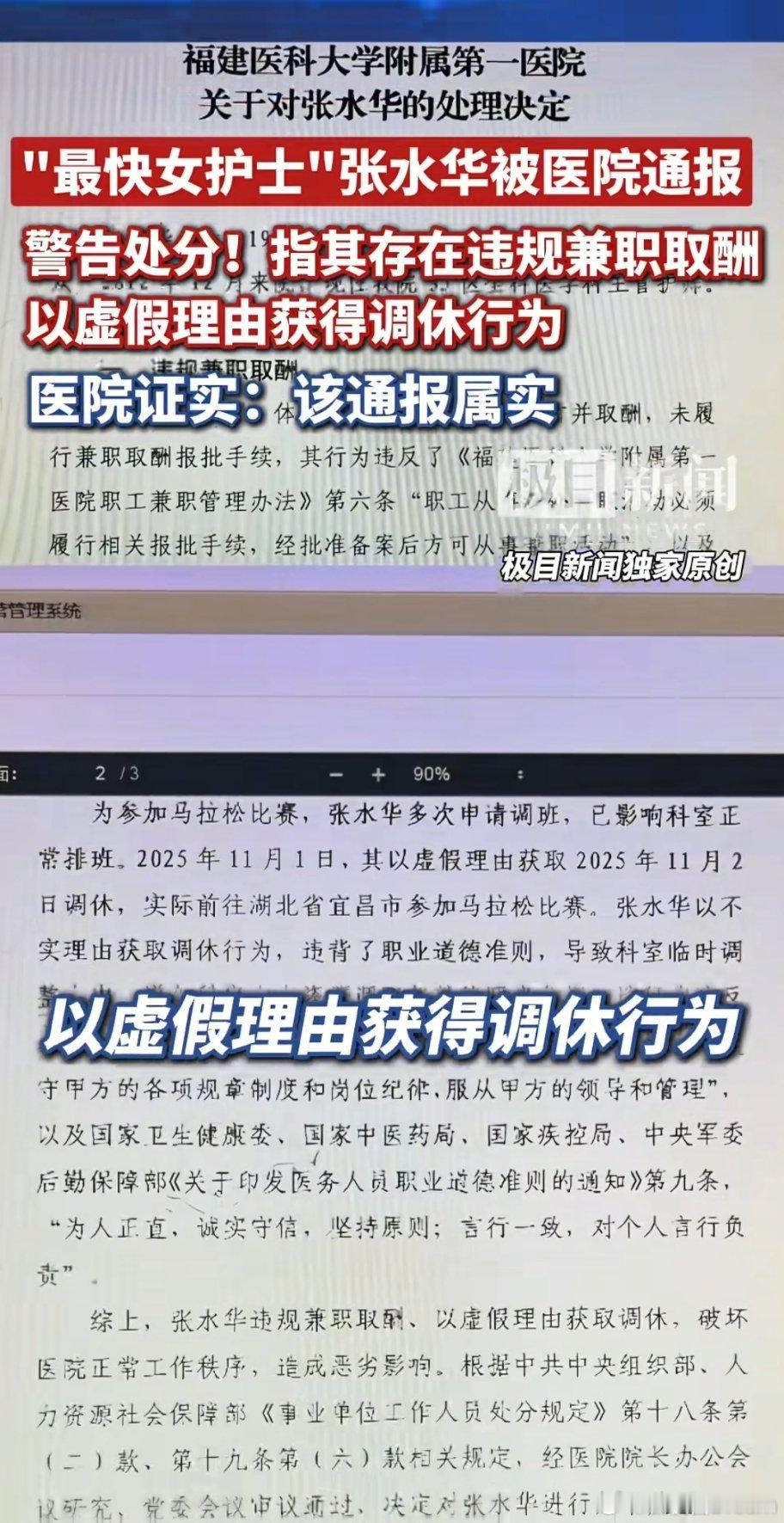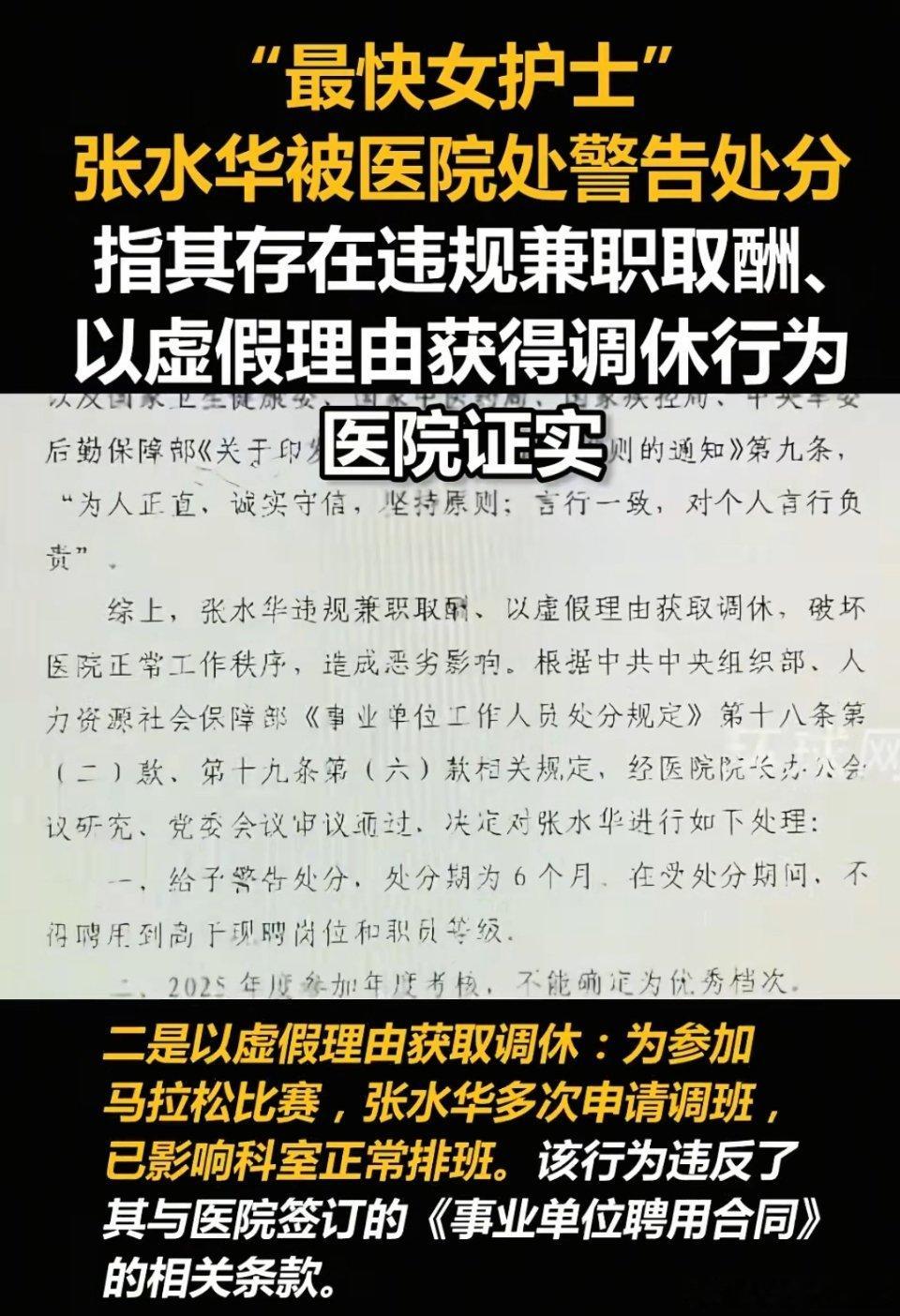医院回应最快女护士张水华被处分最快女护士被处分了。跑马拉松这么赚钱?当初还嘴硬跑马不影响上班,现在被打脸了。多次申请调班,已影响科室正常排班。都这样了还没开除,医院也算是仁至义尽了。