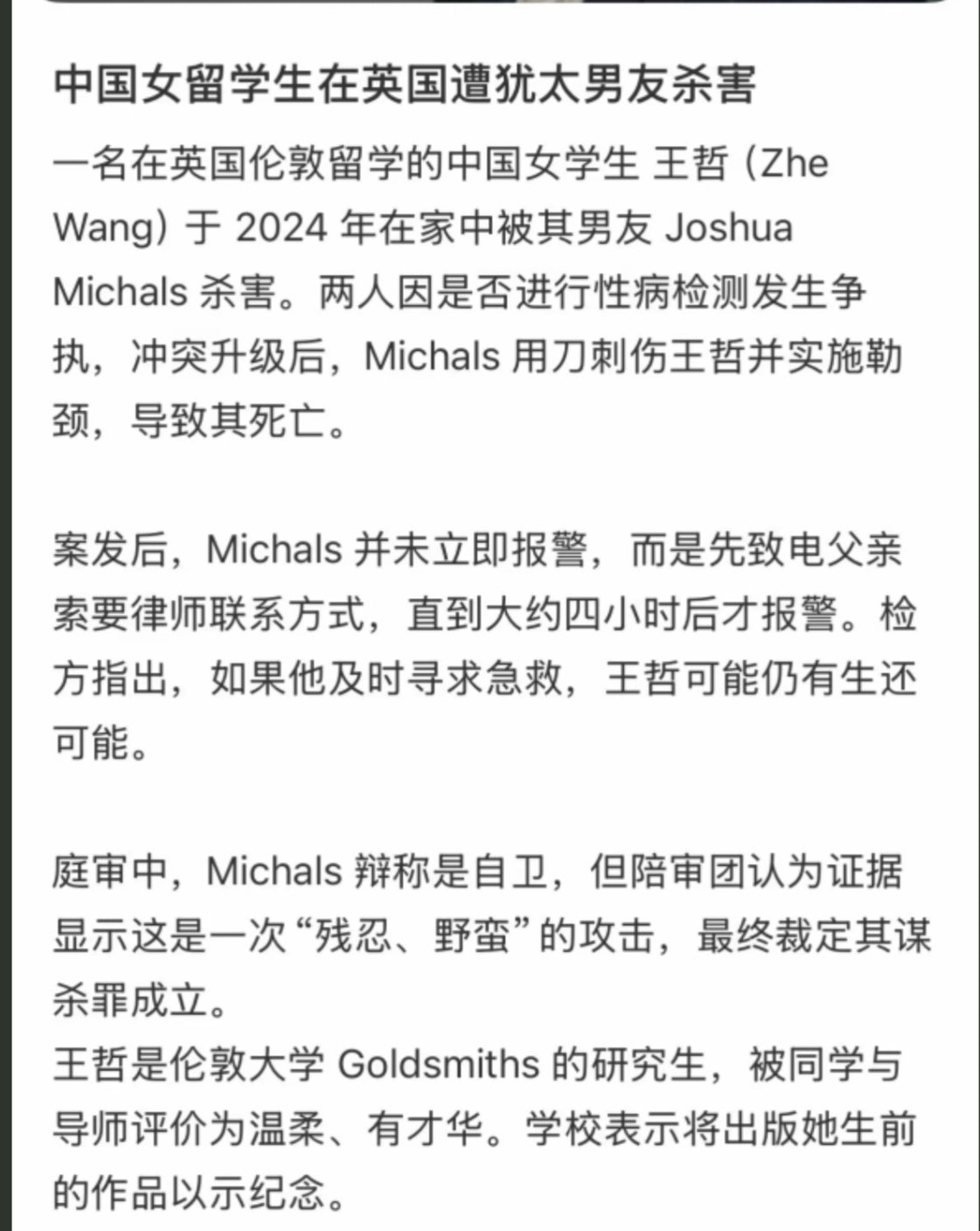 在英国被杀害留学生曾担心感染性病男方26岁,Joshua Michals 约书亚·迈克尔斯,看名字就是犹太人,女方31岁挺漂亮的,咋会看上这个男的呢? 这男的如果第一时间不是给家里打电话,而是打急救,或许结果就不一样了。在外一定要保护好自己,外国变态很多。