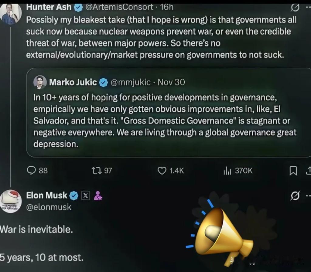 马斯克深夜预警! 科技圈“风向标”马斯克又抛重磅言论!近日深夜,他在社交平台发文直言“战争大概率难以避免,预计五到十年内或将爆发”。 这番警示没有丝毫缓冲,迅速引爆全网热议,让不少人意识到和平或许并非理所当然。 作为长期关注全球安全的科技大佬,马斯克的预测绝非空穴来风。他精准点出三大核心诱因: 当前全球经济增速持续放缓,IMF预测2025年全球经济增速仅3.2%,贸易保护主义抬头加剧资源争夺。 多国人口出生率断崖式下滑,劳动力短缺与社会结构失衡暗藏危机;更关键的是,军事人工智能快速发展却缺乏统一规范,算法决策“黑箱”与军备竞赛风险正在累积。 他特别强调,如今阵营对立、外交沟通弱化等态势,与两次世界大战前的历史情境高度相似。 最引人深思的是他提及的认知鸿沟:顶层决策与研究圈层早已聚焦人类长远安全布局,五角大楼“Replicator”无人机计划、星链军用版部署等动作不断。 而多数普通民众仍困于日常生计琐碎,对潜藏的全球风险感知不足。 和平从不是与生俱来的权利,而是需要共同守护的脆弱平衡。马斯克的警示或许刺耳,但却为沉迷于安逸的世界敲响了警钟。 你认为这些隐忧离我们有多远?欢迎在评论区留下观点~