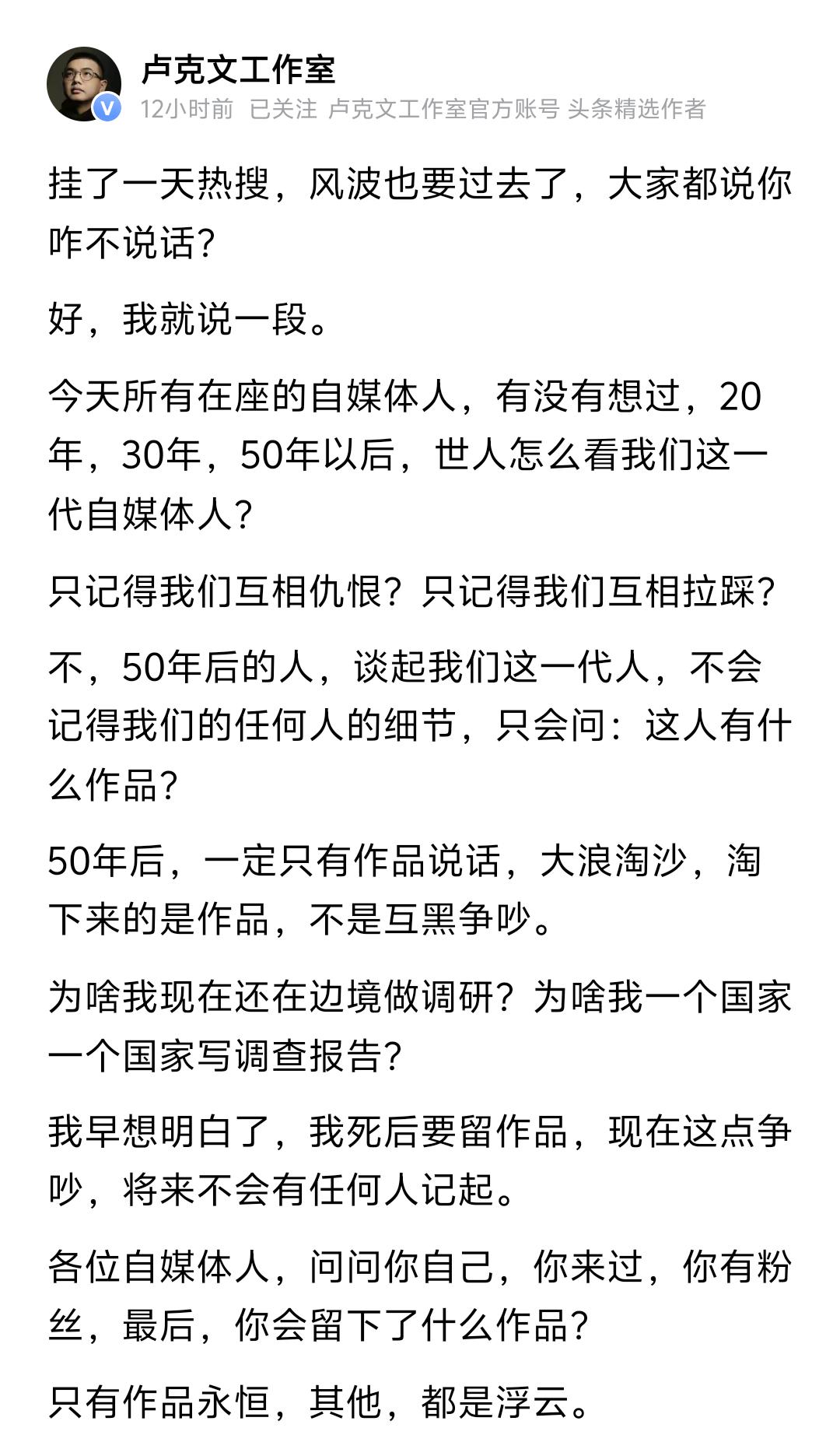 卢克文说:只有作品永恒,其他,都是浮云!心有戚戚焉。作为一个写手,或者说文字工作者,究竟该以什么为写作准绳?其实是件蛮矛盾的事。因为你写的,别人不一定喜欢看;所以为了让别人喜欢看,你就必须不断调整自己。所以到最后,很多人只是写手,少部分留下作品,极少部分成为传世创作者。