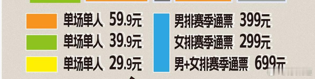 排超联赛河北女排保定赛区这票价有股“超市味儿” 单场单人 59.9元/39.9元/29.9元 男排赛季通票 399元女排赛季通票 299元男+女排赛季通票 699元