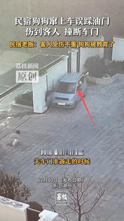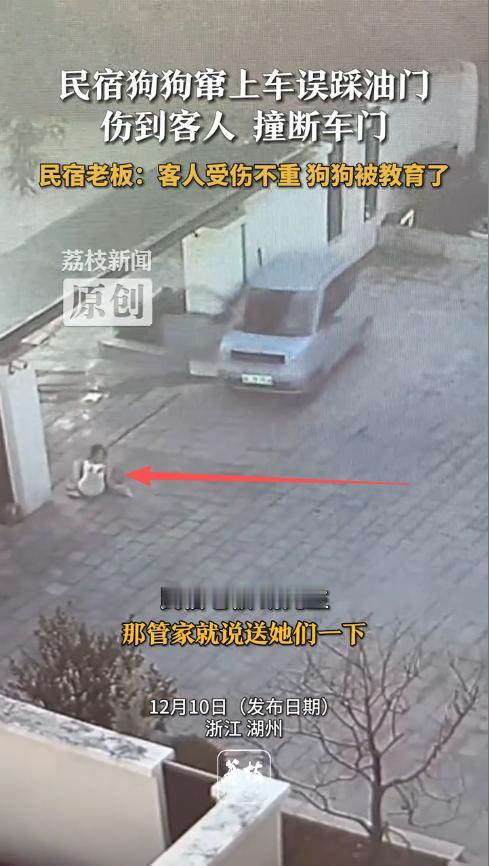 “离了个大谱!”12月9日,浙江湖州,一男子开车送客人离开时,狗狗突然窜上了车,男子挂上倒挡后下车抓狗,结果狗在惊慌中,意外踩到了油门,车辆快速向后方驶去,将客人撞倒在地,车门也报废了!网友:会开车的狗可不多见! 开车的司机都知道,下车前一定要熄火、拉好手刹,这样才不会发生意外,但有时下车的时间不长,很多人就会忘记拉手刹,结果就出事了。 当天早上,两名女子从民宿收拾好后,就准备去赶高铁了,由于民宿所在的位置不好打车,工作人员就准备开车送她们出去。 可是刚准备倒车离开,院子里的狗突然挣脱束缚,直接冲进了车里,这可把两名女子吓了一跳。工作人员见状,立即下车去赶狗。 结果狗子车上挣扎时,一脚踩在了油门上,小车瞬间朝后方冲去,还将一旁看热闹的女子刮倒在地!等到车子停下来后,狗狗意识到自己闯了祸,迅速从车窗跳出,拔腿就跑。 老板得知后,先是将两名客人送走,随后好好教育了狗狗,至于车门,就需要等有时间送去换了。 网友看后表示,事实证明,自动挡的车就连狗都会开!闯出来这么大的祸,这狗子估计少不了一顿胖揍了,以后一定要严加看管,幸亏这次没出啥大事。 信息来源:《12月10日(报道)民宿管家准备开车送客人去火车站,狗狗跑上车误踩到油门把客人撞伤,民宿老板:客人受伤不严重,狗狗被教育。》上游新闻