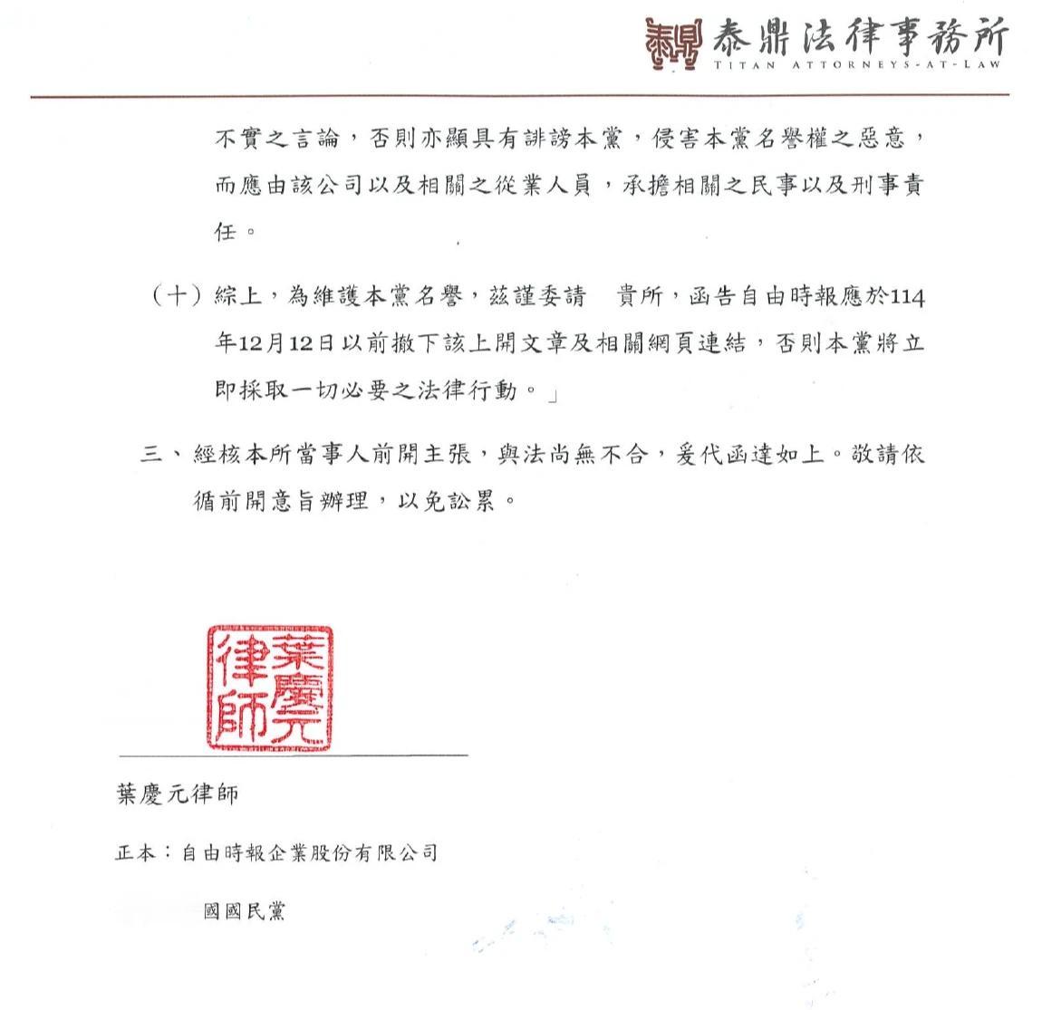 不满被造谣 郑丽文发律师函 要求《自由时报》澄清报道 并澄清近期绝无赴陆计划 2025年12月10日,近日,《自由时报》报道国民党主席郑丽文将在农历年前后赴陆,并炮制所谓“三张门票”条件,引发广泛关注。 对此,郑丽文在国民党中常会上严正澄清,称报道完全为绿媒编造,强调她已经委托国民党文传会主委吴宗宪向《自由时报》发出律师函,并要求该媒体撤回错误报道。 郑丽文在会上表示,关于其赴陆的所有细节和时程安排甚至连她本人和副主席们都未曾明确获知。她批评该报道根本没有事实依据,称其不仅无视基本的新闻核查责任,还极有可能导致社会误解。 她进一步指出,国民党与对岸的交流一贯以“九二共识”和“反对台独”为基础,绝不会接受任何附加条件或自我矮化。 吴宗宪也在会上评论了《自由时报》的报道,认为该媒体完全未尽新闻调查责任,直接传播未经证实的信息。 吴宗宪批评道,这种造谣行为不但误导公众,还扰乱了社会秩序。对于是否提起法律诉讼,吴宗宪表示,国民党将在内部讨论后做出决定,但律师函中已明确要求《自由时报》在12月12日前撤下相关报道,否则将采取进一步法律行动。 至于是否会在农历年前后赴陆,吴宗宪明确表示,目前完全没有相关安排。他强调,国民党始终秉持“九二共识”和反对台独的立场,且历届交流都没有以任何附加条件。 嗯,那好像也没有来的必要了吧!