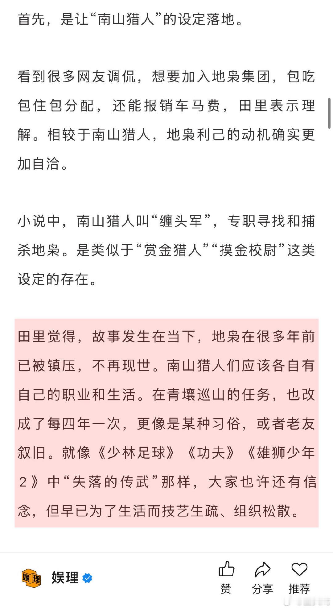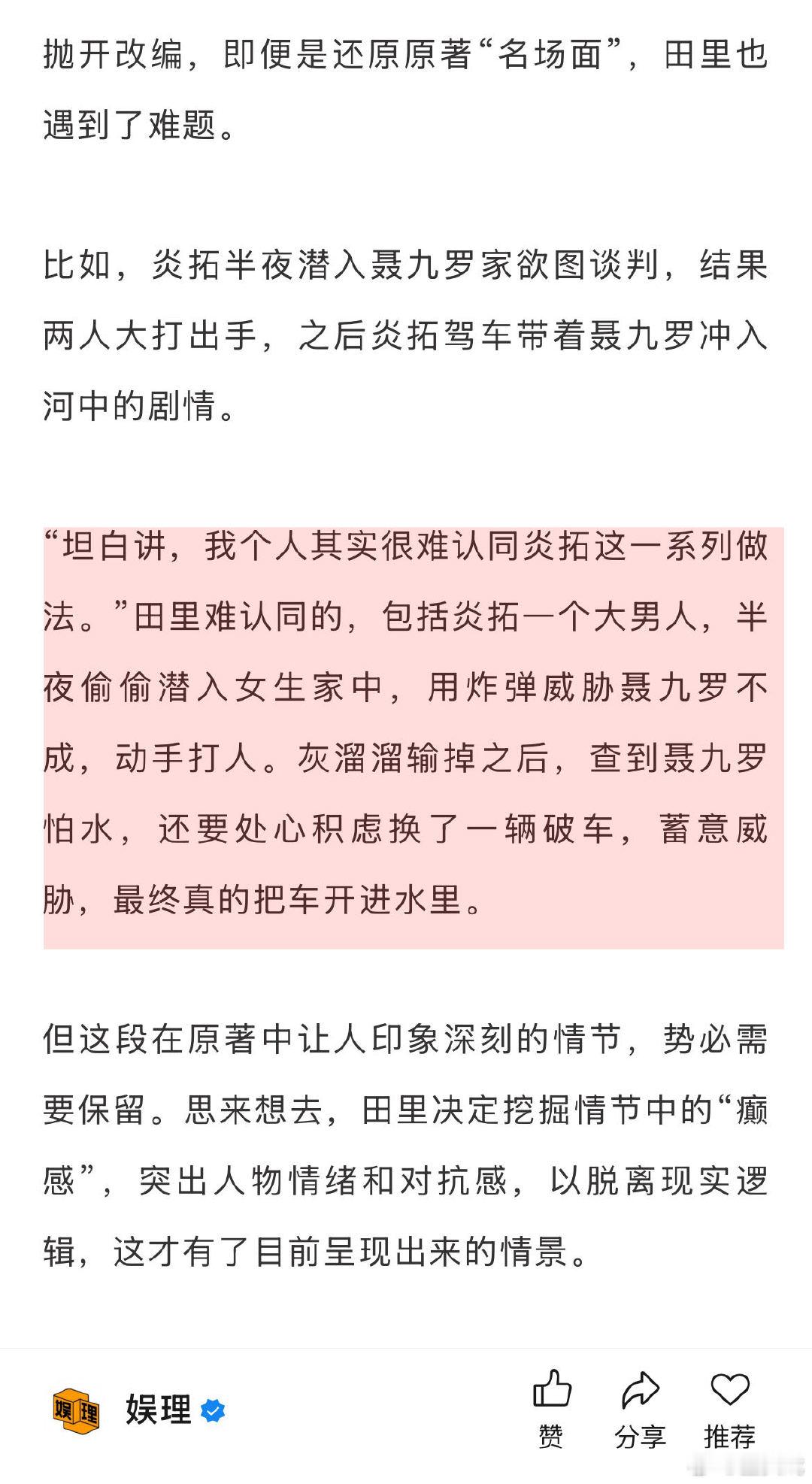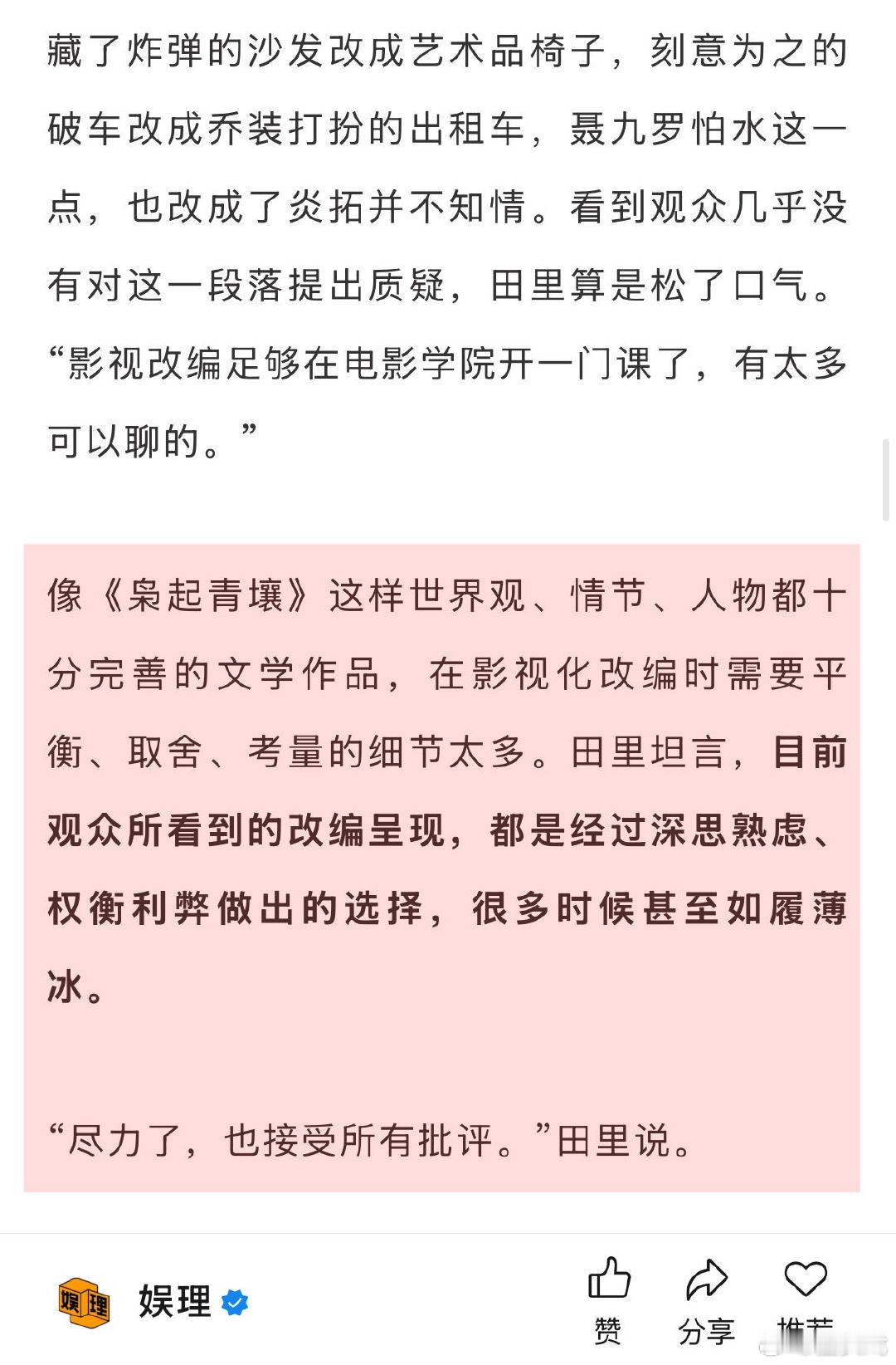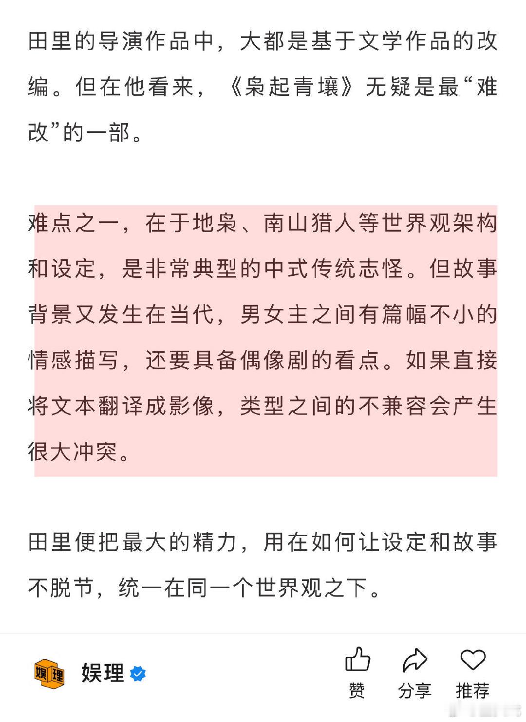 田里说迪丽热巴是导演友好型演员 导演回应枭起青壤美学 像《枭起青壤》这样世界观、情节、人物都十分完善的文学作品,在影视化改编时需要平衡、取舍、考量的细节太多。导演田里向坦言,目前观众所看到的改编呈现,都是经过深思熟虑、权衡利弊做出的选择,很多时候甚至如履薄冰。“尽力了,也接受所有批评。” 娱理独家↓