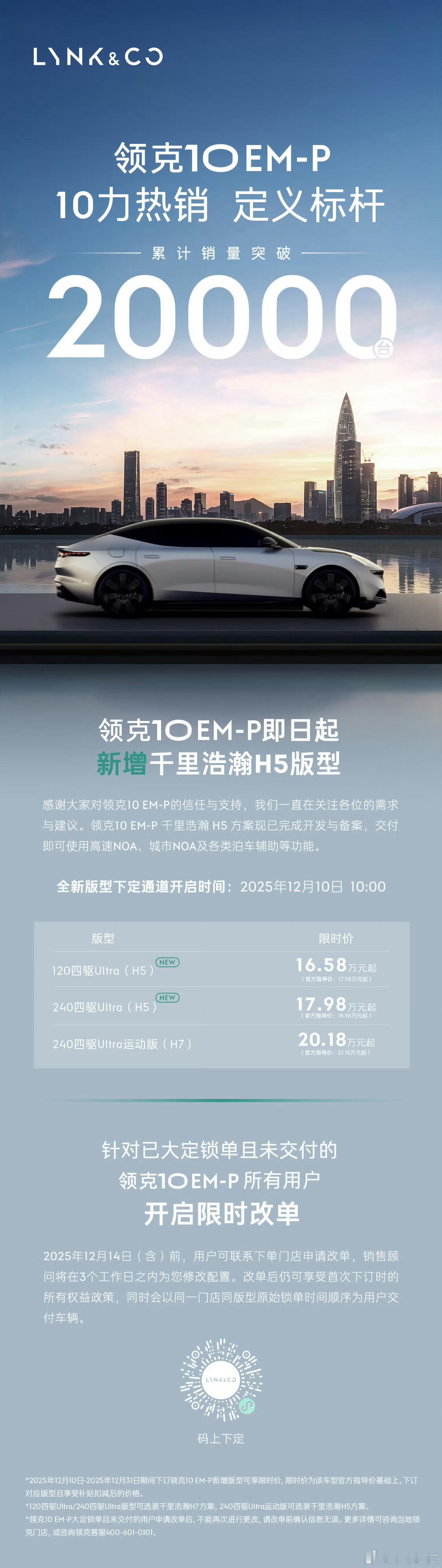 领克10EM-P销量快速突破2万领克10 EM-P太能打了!上市才三个月就卖了2万多台,稳稳扎在细分市场前三,平均成交价快19万还能卖这么好,直接在中大型插混轿车里杀疯了!领克10 EM-P我试驾过,全系eAWD四驱,零百加速5.1秒,铝合金双叉臂前悬+五连杆后悬,开着是中大型插混轿车里的佼佼者。而且不只是快,CLTC纯电240km、亏电油耗4.2L,续航无忧。智能方面,8295芯片的FlymeAuto 2车机,辅助驾驶有H5、H7可选,现在还新增了H5版本,120四驱16.58万起、240四驱17.98万起,提车就有高速和城市NOA,还有全场景泊车,智电四驱和激光雷达全系都给,配置诚意直接拉满!高价值混动轿车首选