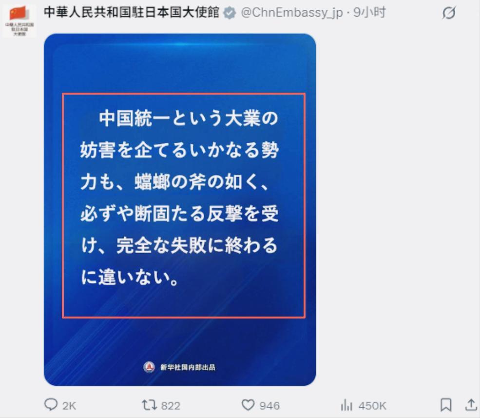 12月9日中国驻日本大使馆发布了一张海报,让日本网民非常“不爽”。 这张海报是在社交媒体上发的,上面用日语写着,大概意思是谁敢阻挠中国统一,就是痴心妄想,最后一定失败。 海报本身很严肃,但抢戏的是评论区,不少日本网民在下面阴阳怪气,留言“地震了,忙着呢别发了”“有本事地震后再发”“先放着,等地震过去再说”“现在发这个合适吗?” 意思说日本刚地震,你们这时候发这种内容,不合适吧? 但我个人认为中国驻日本大使馆发这个内容,没什么不合适的。是他们自己玻璃心。为什么呢,我是这样想的: 一者不能混着说事。台湾省问题本来就是中国内政。日本地震是日本内政。我们不去指挥日本怎么救灾,那日本也别对中国的主权问题指手画脚。这是前提。 再说了,发海报也不等于没人道。日本发生地震后,中方并没有幸灾乐祸。相反驻日使馆第一时间也发了提醒,提示在日中国公民注意避险、遵守当地秩序。该关心的关心,该救助的救助,这叫基本的人道立场。 还有日本网民说不合时宜,其实没抓到重点。这张日语海报之所以出现,有个背景就是日方那边近期在涉台问题上有人说了不该说的话,碰了中国主权底线。这件事和地震是两条线,不能拿地震当挡箭牌,更不可能说你地震了,我就不追究你说错话了。 说白了就是主权问题要讲原则,该表态就要表态。地震救灾讲人道,该提醒就提醒。两件事并不冲突。 希望日本网民别把两件不相干的事硬绑在一起,先把来龙去脉搞清楚再下结论。 日本不顾国际社会反对强排核污水进大海的时候考虑他国,考虑他国人民感受了吗?