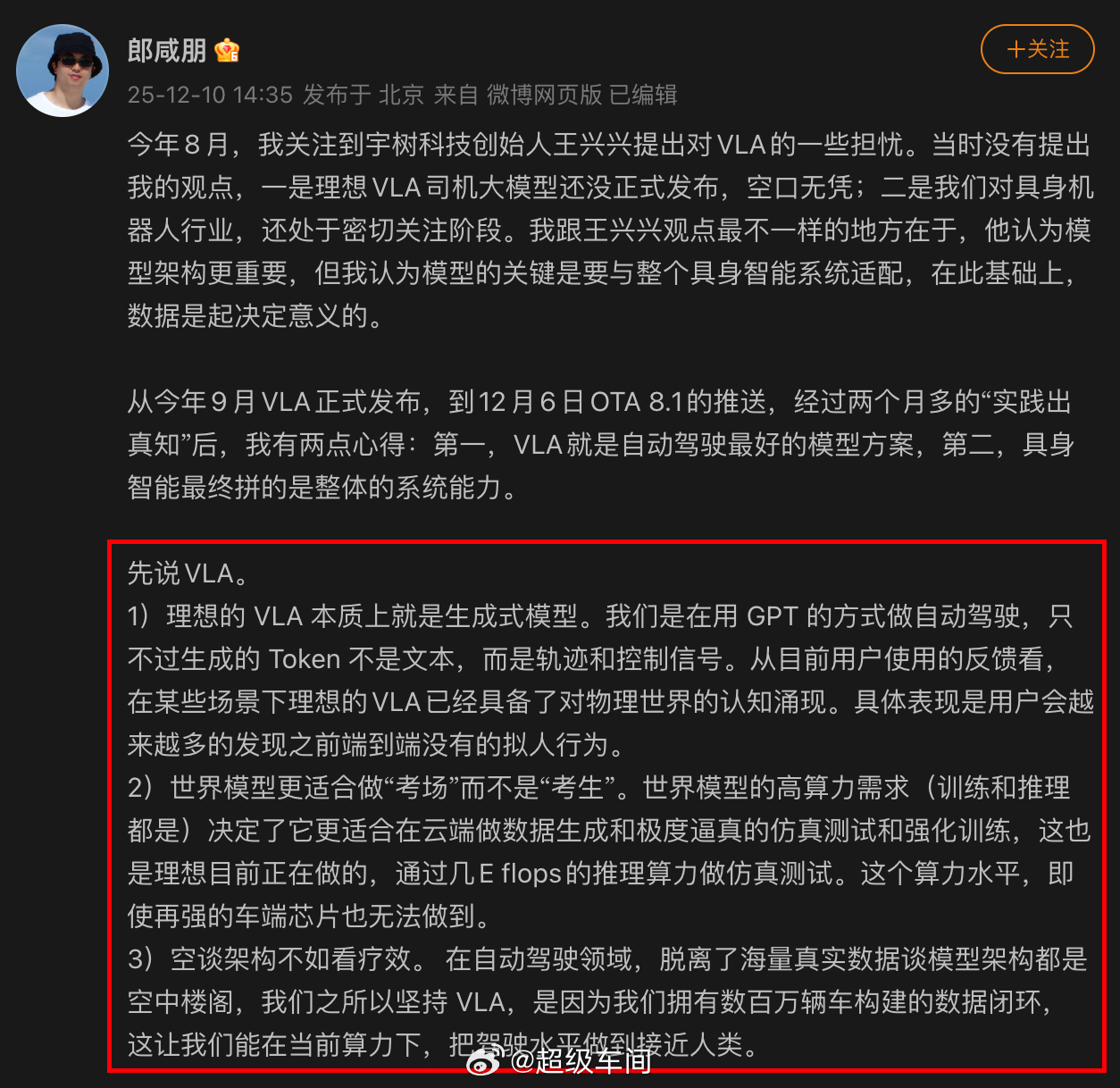 理想高管回应王兴兴质疑理想汽车 理想汽车自动驾驶研发高级副总裁郎咸朋刚刚在微博就近期行业关注的“VLA技术路线争议”及理想在VLA与具身智能领域的布局进展进行公开回应。此次回应涉及技术路径选择、行业趋势研判等关键议题,值得技术圈与行业观察者重点关注。理想VLA