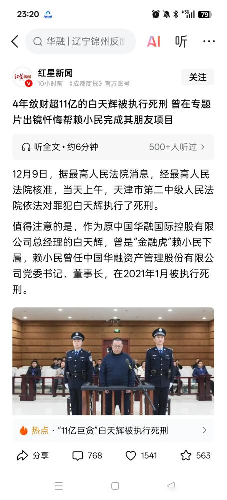 令人拍手叫好,大快人心,为法院点赞! 真令人震惊不已啊,这个中国华融公司,一把手贪了18亿,二把手贪了11亿,通通被判执行死刑啊。 平均下来,每一天都有巨额赃款流入他的口袋,这种贪婪的速度与规模,令人瞠目结舌。 更让人脊背发凉的是,他的上司,那个早已伏法的赖小民,涉案金额更是高达18亿之巨。 一个公司,两任巨蠹,前“腐”后继,将国家的金融重器变成了个人的提款机,其行径之恶劣,影响之深远,堪称触目惊心。 法律的重锤落下,彰显了绝对的公正。 从一审死刑判决,到二审维持原判,再到最高人民法院的最终核准,整个司法程序严谨、审慎,体现了对生命权的极度尊重,更体现了对腐败行为零容忍的坚定决心。 值得注意的是,白天辉案发后并非没有“表现”,他确实有重大立功情节。 但法院的判决清晰地传递出一个信号,功是功,过是过,对于这种严重侵蚀国家根基、透支人民信任的极端腐败行为,功不抵过,罪责难逃! 这彻底堵死了那些妄图“牺牲一人、保全一片”或者以“立功”作为免死金牌的侥幸心理。 白天辉的伏法,与赖小民案前后呼应,构成了中国金融反腐史上一个极具标志性的符号。 它不仅仅是对两个犯罪个体的惩处,更是对整个金融系统、对所有掌握权力者的一次雷霆警示。 它宣告了“刑不上大夫”的潜规则彻底破产,宣告了无论职位多高、权力多大,只要触碰了腐败的红线,必将付出最沉重的代价。 这背后,是国家净化金融生态、维护经济安全的坚强意志,是回应人民群众对公平正义殷切期盼的实实在在的行动。 当我们为法院的果断判决拍手称快时,更需深思,为何巨贪总在“前车之鉴”后仍敢“后车之覆”? 权力的监督制衡是否还有待加强? 制度的笼子是否扎得足够紧密? 反腐惩恶是治标,而如何从源头上遏制腐败,让领导干部“不想腐、不能腐、不敢腐”,才是更深层次的课题。 白天辉案如同一面镜子,照出了腐败的狰狞,也映照出反腐斗争的长期性与复杂性。 这场胜利大快人心,但脚下的路依然很长,需要的是常抓不懈的韧劲和更加完善的治理体系。 正义的枪声已经响起,这是对腐败分子的终极严惩,更是对共和国法治尊严的庄严宣誓。 它告诉所有人,在中国这片土地上,没有什么“金融神话”,没有什么“权贵资本”,在法律的天平面前,人人平等。 这声声枪响,是告慰,是警示,更是新征程的号角。 反腐利剑高悬,清风正气必将涤荡每一个角落!