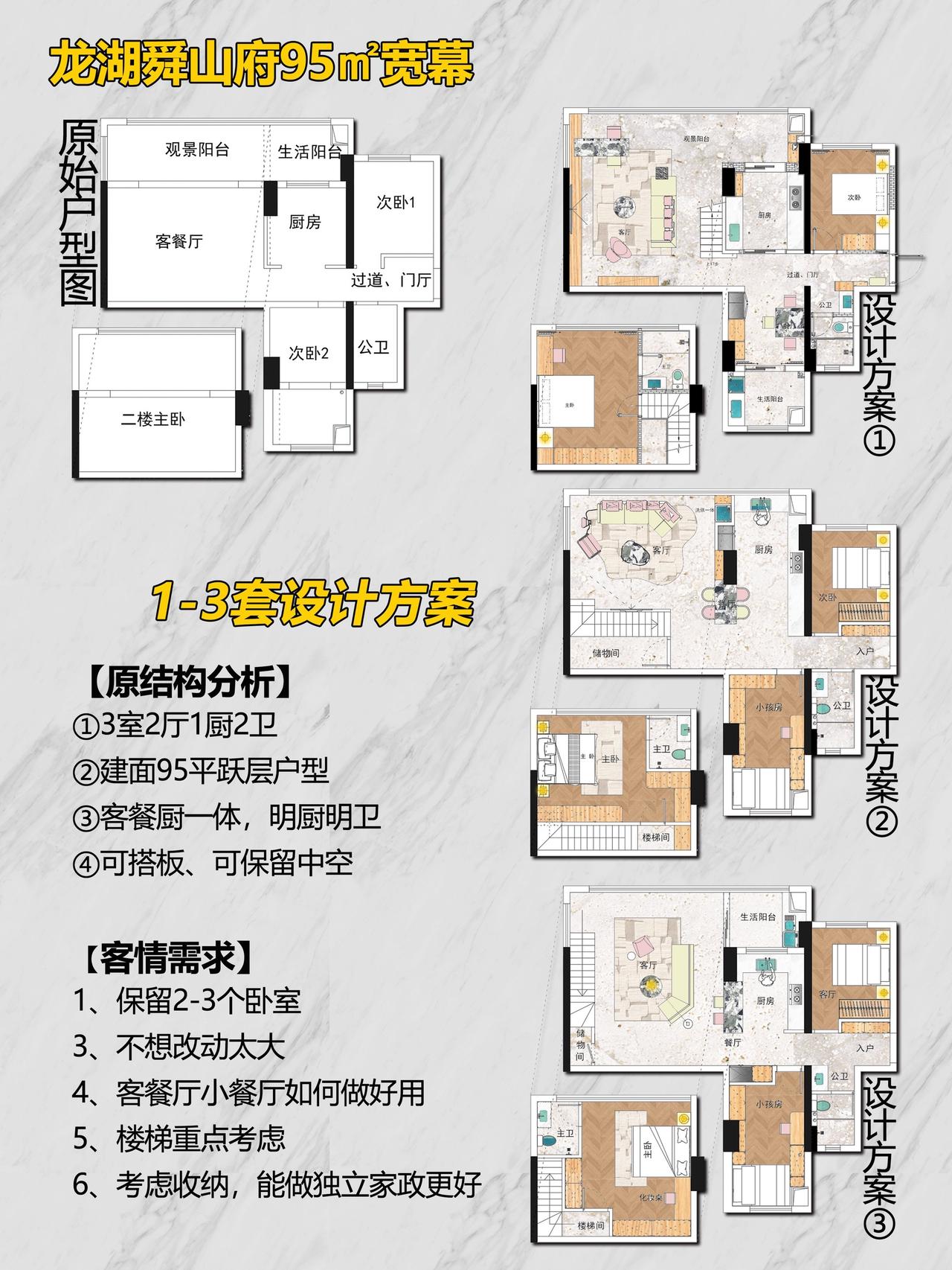 哈喽👋接上一次龙湖舜山府户型研发后,一位粉丝朋友刚好刷到,恰好也是95平方米的跃层同户型🏡所以把他的新家交给了我,接下来一起从方案到效果欣赏一下吧! 项目信息📋 📍楼盘:龙湖舜山府 🏠户型:跃层 📏面积:95㎡ 🎨风格:简约原木风格 🏠【原始户型分析】 ①3室2厅1厨2卫 ②建面95平跃层户型 ③客餐厨一体,明厨明卫 ④可搭板、可保留中空 📝【客情需求】 1、保留2-3个卧室 3、不想改动太大 4、客餐厅小餐厅如何做好用 5、楼梯重点考虑 6、考虑收纳,能做独立家政更好 🎨【设计解说】 这位粉丝客户要求在原始户型图上做小的调整,能不动的就不动,3个设计方案选择的是第一个方案,主要改造的还是楼梯的位置,以及把其中一个卧室作为餐厅和洗衣房来使用,风格上选择的是简约原木风。 👉【关于我】 一位充满热情、细心、靠谱的90后设计师。拥有别墅、洋房、跃层、大平层、普通住宅10年设计经验。为装修设计发愁的你排忧解难! ✅擅长风格 意式、新中式、现代简约、奶油风、宋式美学、中古风、法式风、现代轻奢等… 📄【个人案例】 中铁阅花溪|中铁逸都|中铁阅山湖|阅山湖云著|华润悦府|中海映山湖|茅台广场|美的林城|金融城|融创九樾府|中海印龙泉|华润九悦|龙湖天曜|龙湖湖山原著|万科鸣翠|万科麓山|铁建城|龙湖舜山府|远大美域|观山小区|建发和玺|保利公园 。。。。。。 贵阳装修 龙湖舜山府 全案设计 贵阳星艺装饰