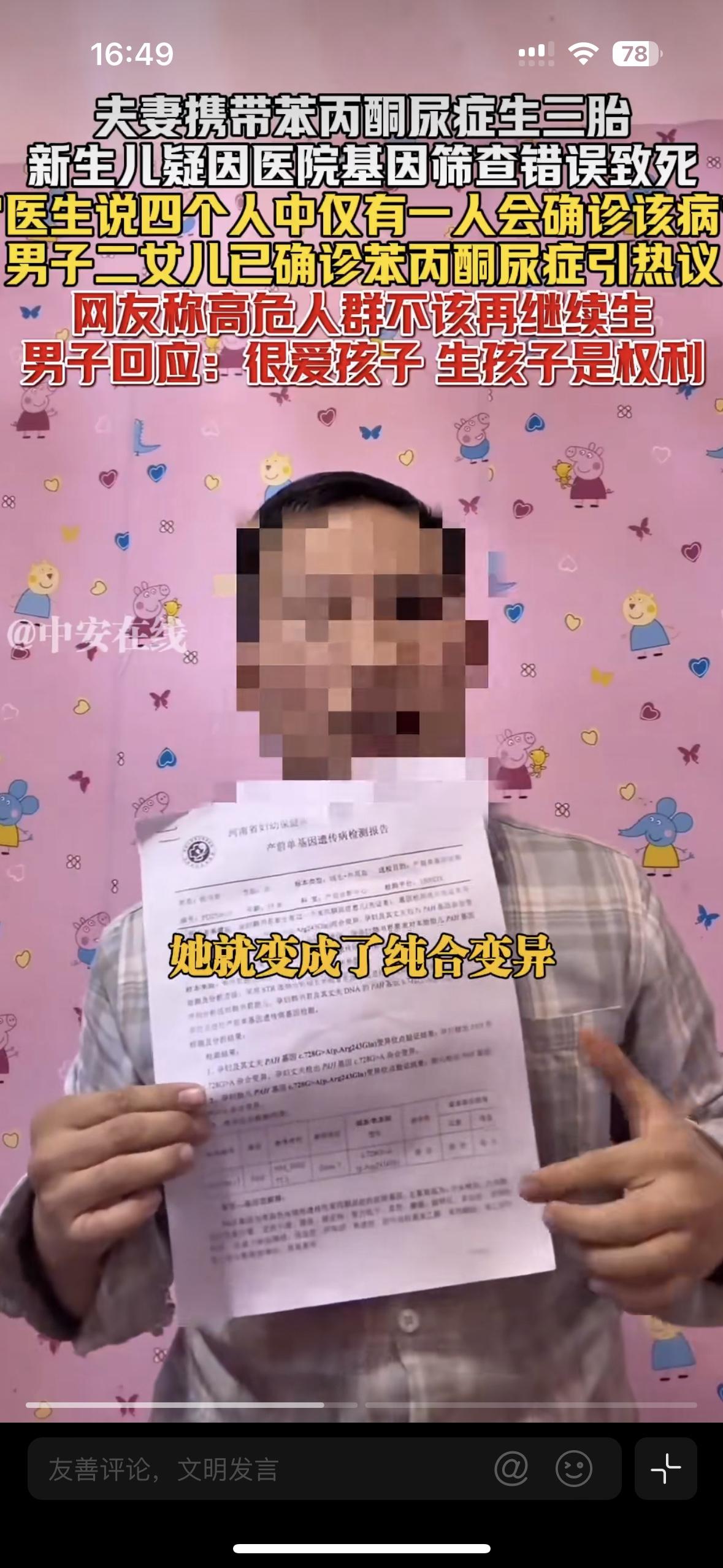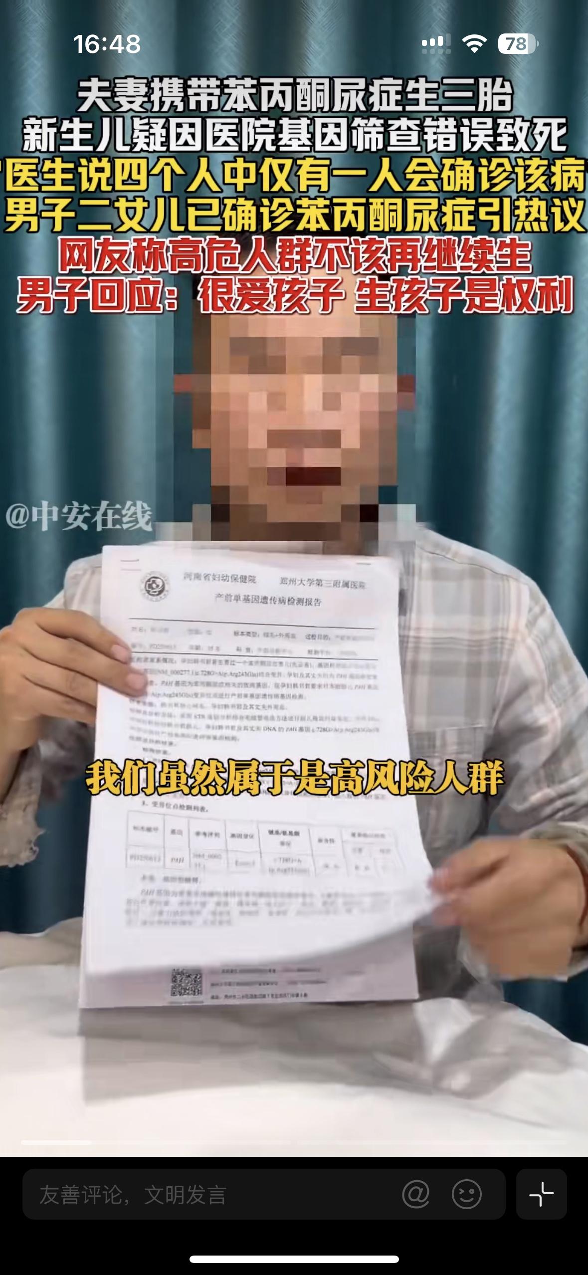 真没见过这么蠢的人!同情不了一点!这不是医院的问题,也不是医生的问题 是你们基因的问题,可怜了孩子 一位爸爸在网上控诉医院因筛查错误致死。可事实是夫妻携带苯丙酮尿症生三胎,明明2女儿已经确诊了苯丙酮尿症 已经有2个女儿了,还要拼3胎是为了要个儿子吗?医生的意思是每一胎都有1/4的概率会患病,这男的理解成生4个只有1个患病! 这么高概率的基因病就是一胎都不生才是最负责的!是真响应国家号召生三胎还是为了追生儿子自己心里最清楚