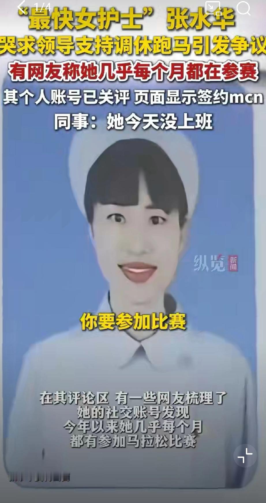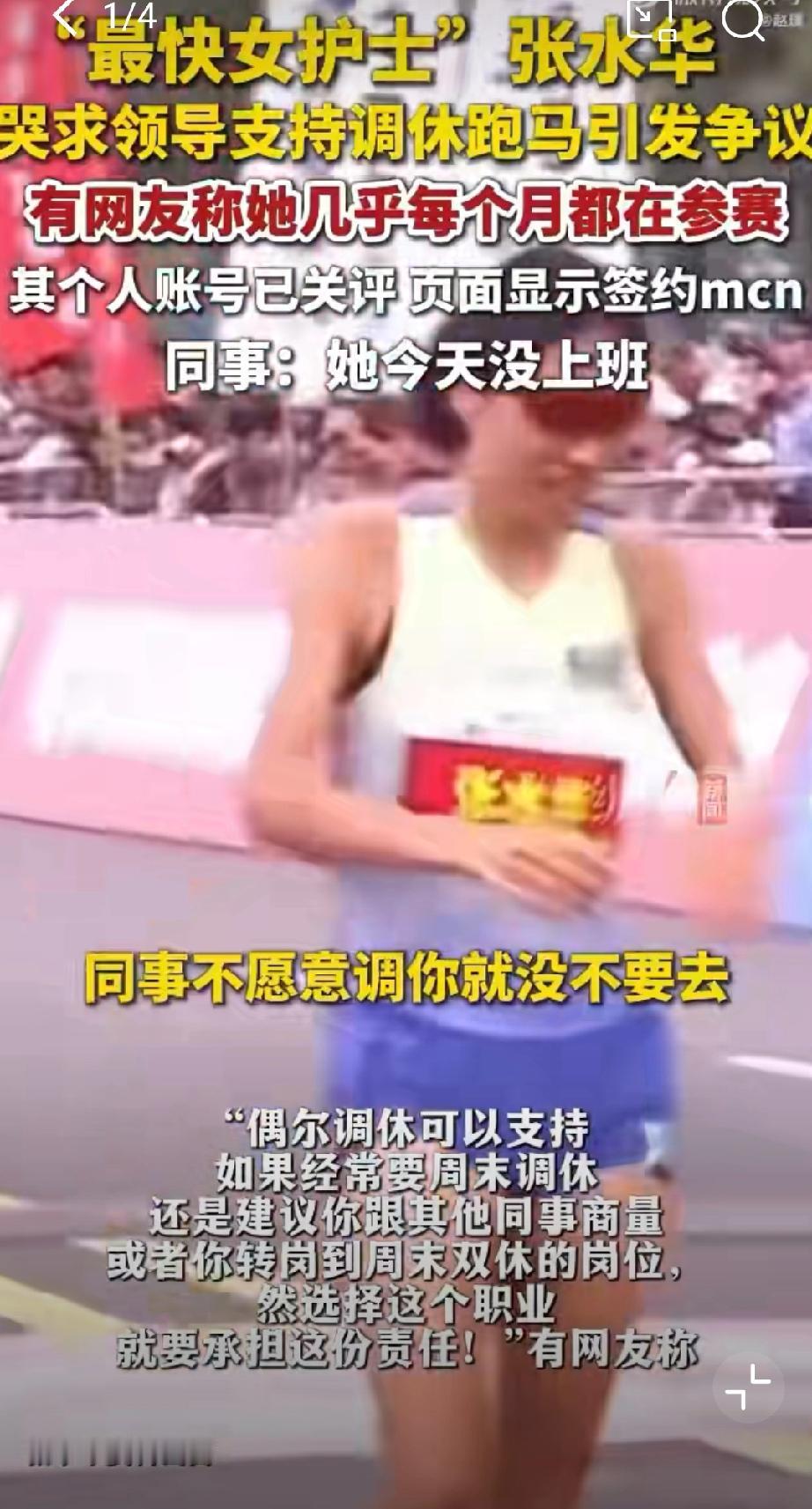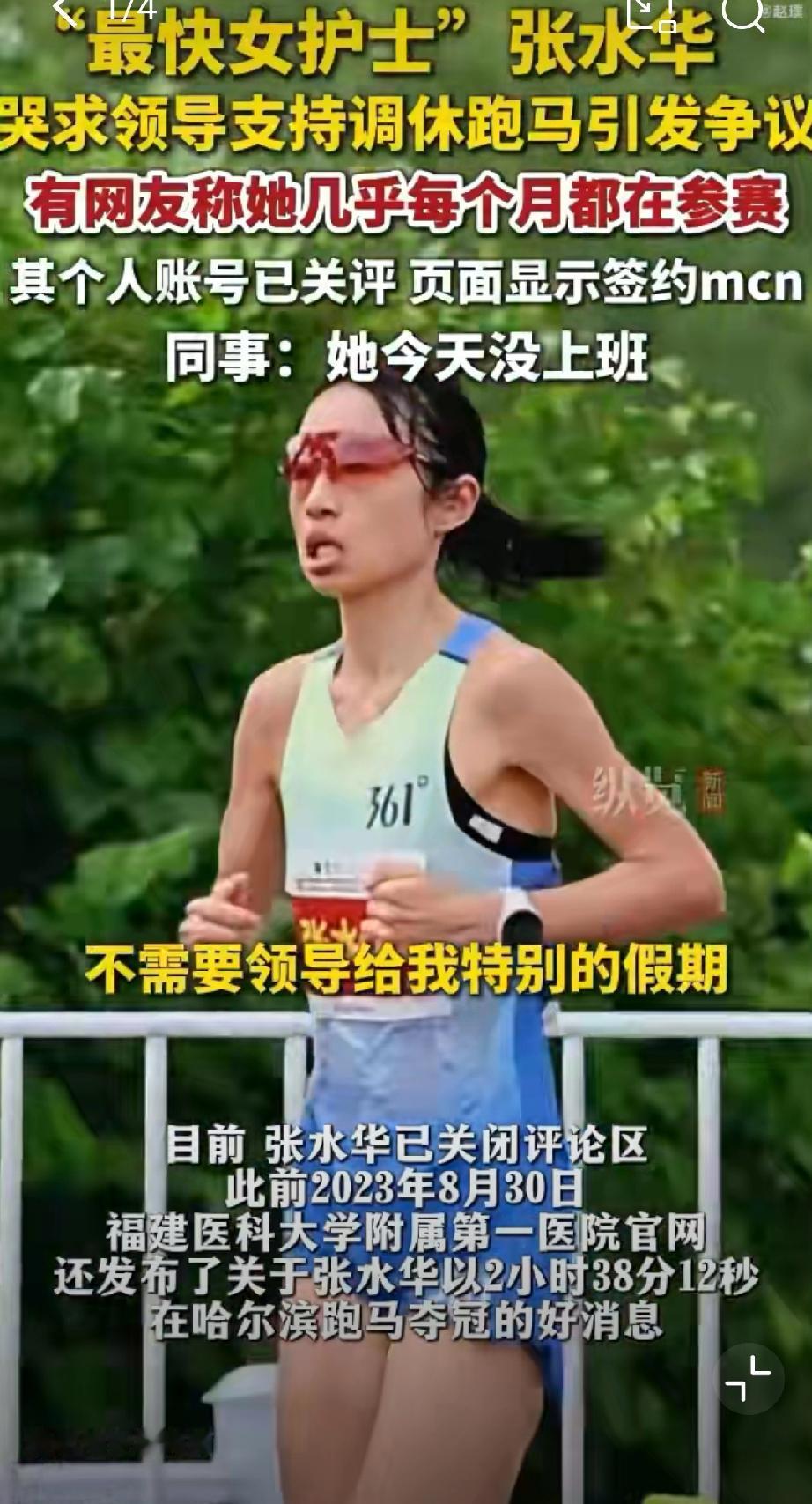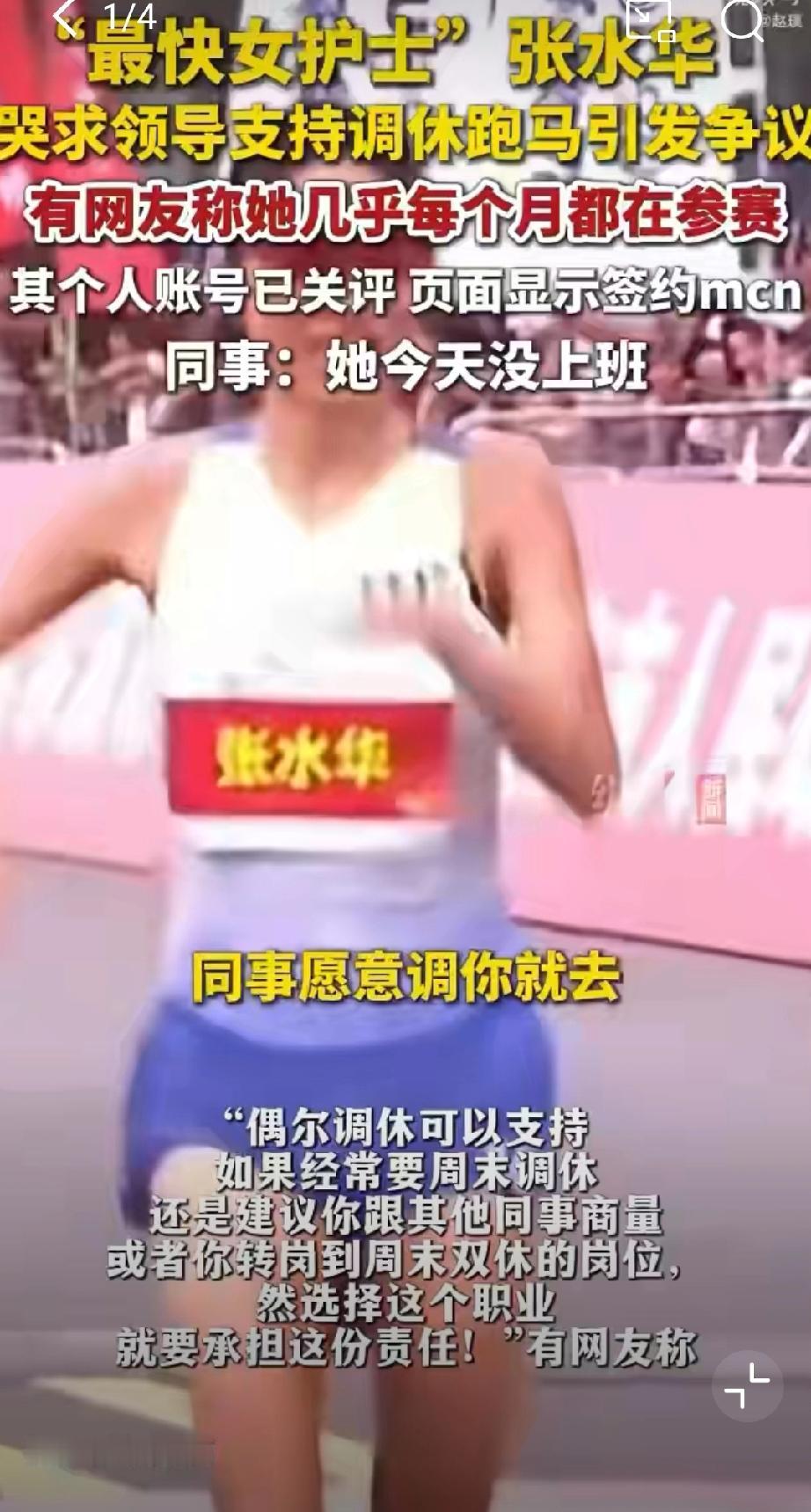 最快女护士被医院警告处分6个月。 前段时间,赛后阴阳领导的最快女护士张水华,被处分了! 1️⃣与361°签约获取报酬未报备,违规兼职取酬的行为; 2️⃣为跑马拉松以虚假理由获得调休违规,破坏了医院的正常工作秩序。 看来还真是仗着自己有点成绩,给医院和同事上眼药了![笑哭] 所以之前发声明说不会让马拉松影响本职工作,只是场面话,这处罚一点也不冤枉啊了……福建最快女护士 医护风波 护士争议