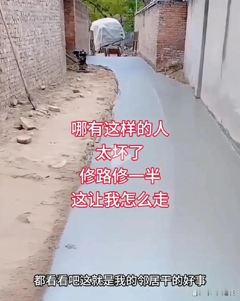 这就是典型的恶人先告状。胡同里住着两户人家里边的那一户说两家一起把胡同的土路修一下,大家走起来都方便。两家一起凑钱,就修成水泥路,但是外面这一户人家不想花钱,就没有同意一起修路,结果里边的那一家只修了一半,把靠近里边的这一半儿给他剩下了。 结果外边的这户人家不乐意了,说那户人家欺负他。把路修成这样,还让他怎么走,他这边比较洼,到时候下雨的时候水都流到他这边来了,就没法走了,还说人家太坏了。从来没见过这样的人,不讲理。