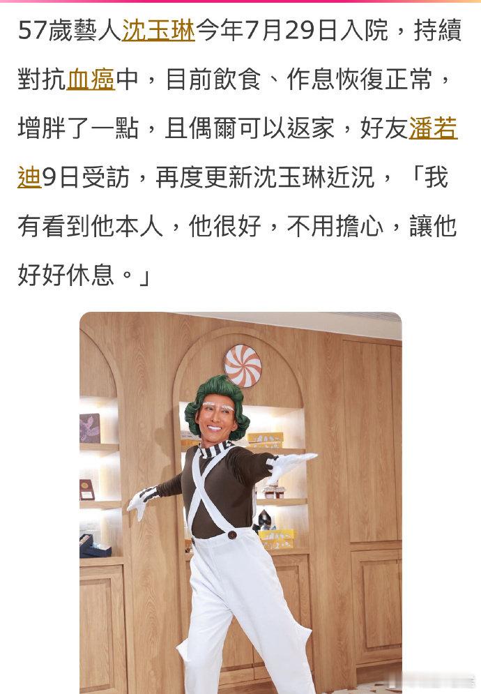好友透露沈玉琳病况 据台媒,沈玉琳好友潘若迪 9 日接受采访时,再度更新沈玉琳近况,“我有见到他本人,他状态很好,大家不用担心,让他安心好好休息就好。”,好友表示自己每天都会通过视频电话关心对方“他大概过年前就能回家,肯定可以的”。沈玉琳于今年 7 月 29 日入院,目前仍在持续对抗血癌,其饮食、作息已恢复正常,还长胖了一点,且偶尔能回家。此前沈玉琳已从三总转院至台大接受治疗。
