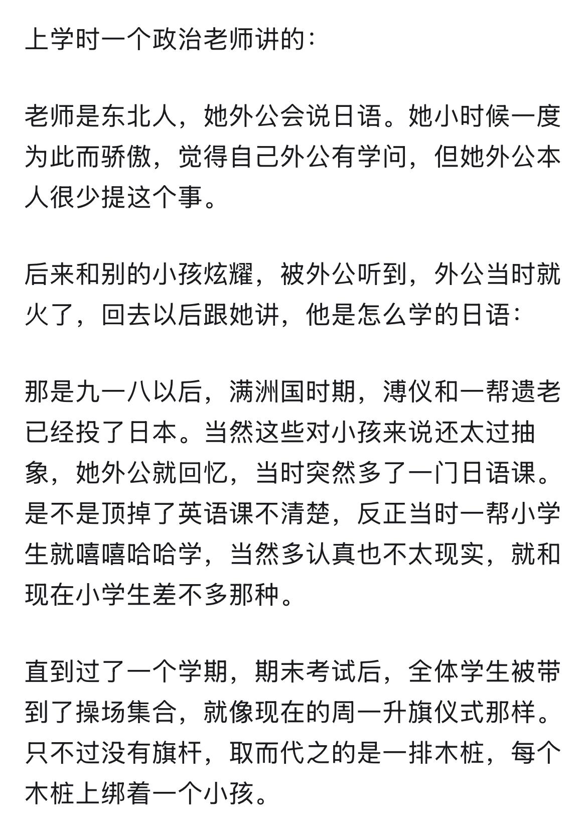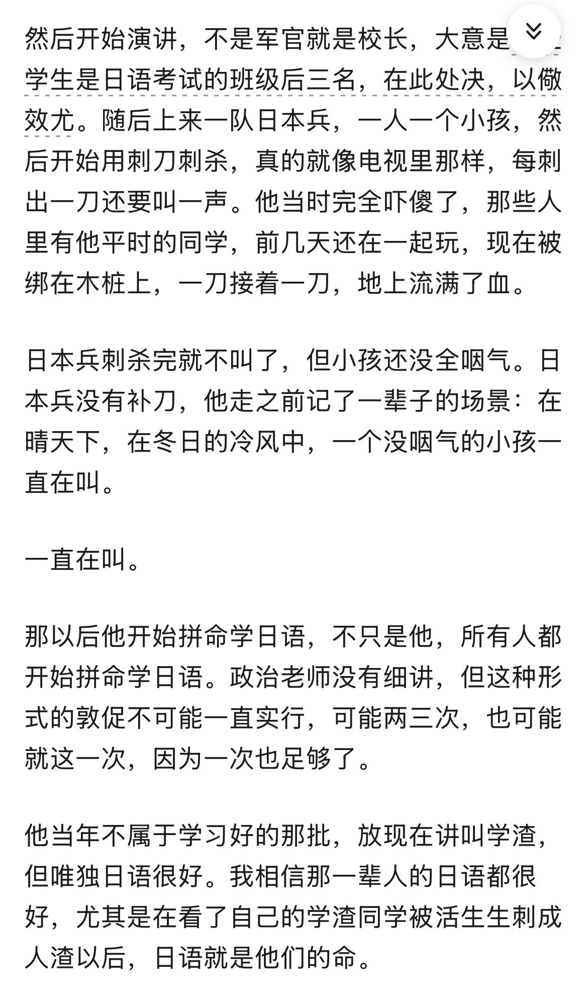 中国孩子学日语,学校各班后三名被日军当众挑死! 网上看到一个事例,就是当年东北的孩子学日语,一开始孩子们天真无邪地也不懂,以为就是多一门外语课,结果到了学期末,一天早上,他们被集合到操场上,发现有很多木桩,上面绑着很多同学,后来才知道,他们是日语考试成绩的班级后三名。 当着这些孩子们的面,日军残忍地用刺刀一下一下捅死了每一个孩子,这个场景,我无法想象,这种人,他们算得上人吗?畜生不如! 有一个孩子,当场没死,一整天,他都在血泊中惨叫,然后慢慢死去……