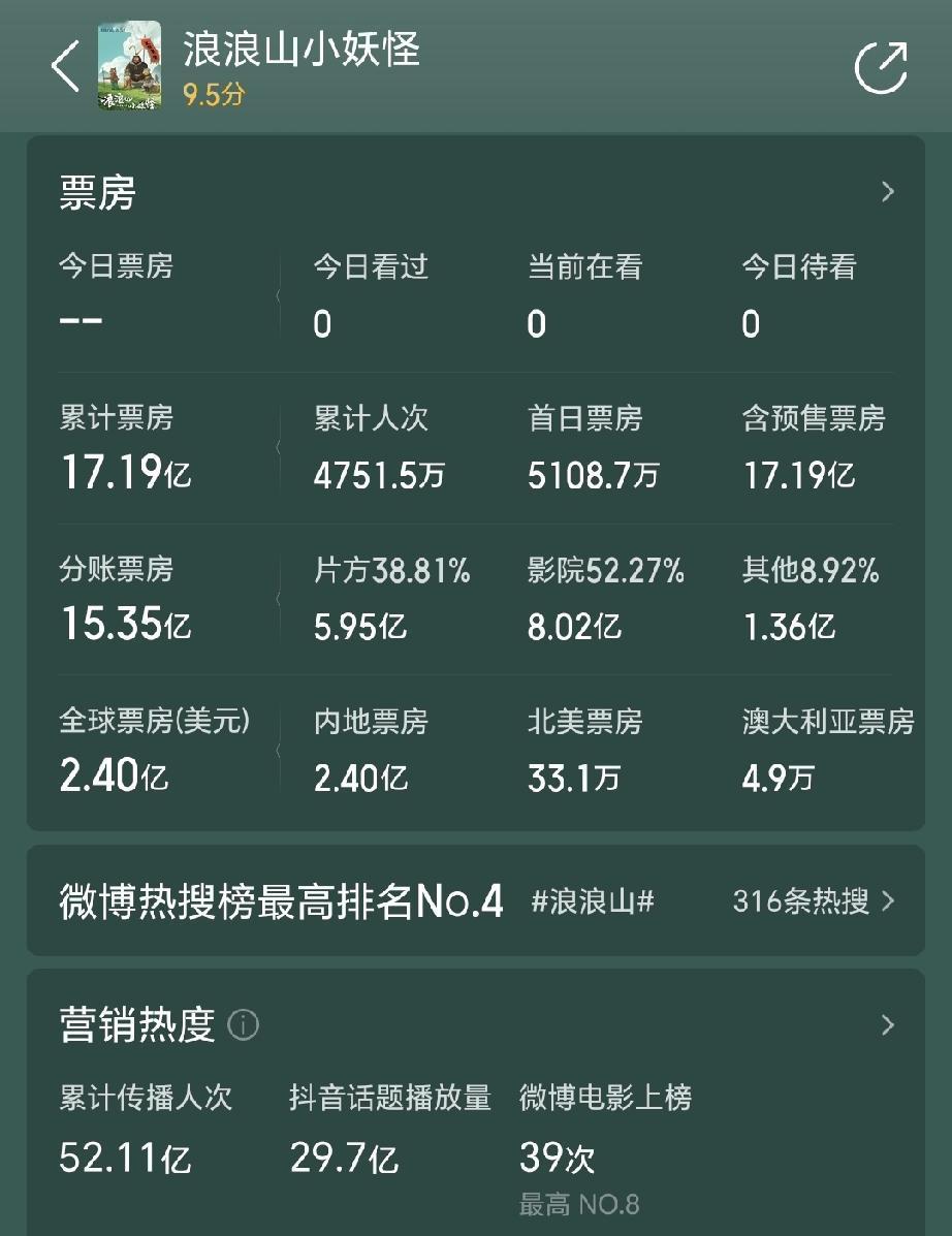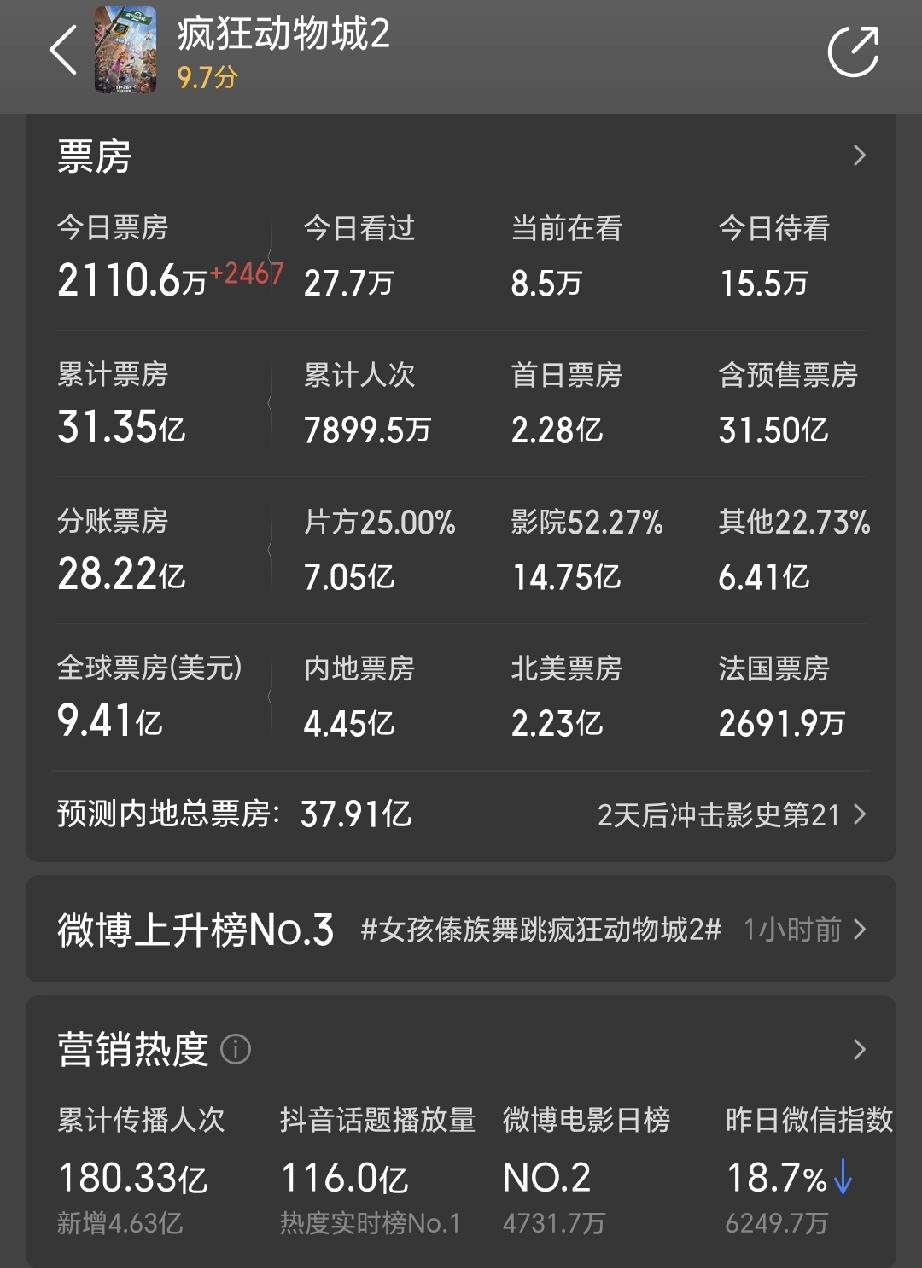 真人电影真没人看了,今年爆火的电影全是动漫,哪吒,浪浪山小妖怪,现在又出来个疯狂动物城。 哪吒154亿票房,抖音播放量238亿。浪浪山票房17亿,抖音播放量30亿。疯狂动物城半个月31亿,预计最终会到37亿,抖音播放量100多亿。 反观真人电影,从年初春节档就一直被动漫电影一路碾压,现在又到年底了,依然没有一个爆款出现。