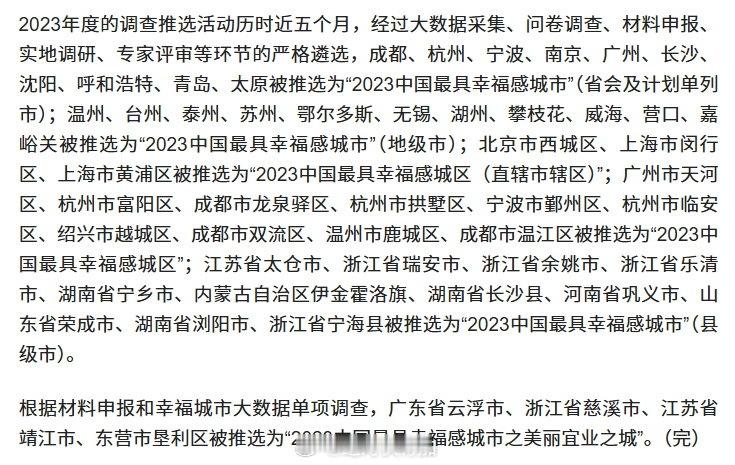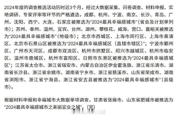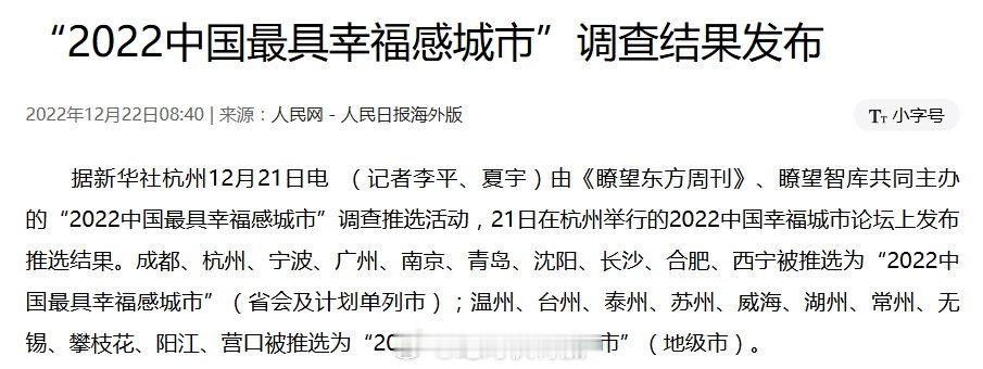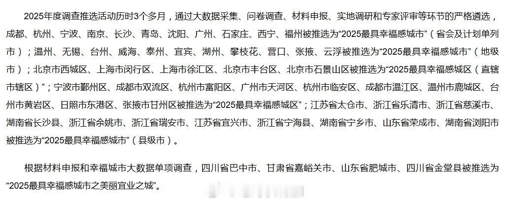 12月9日,由《瞭望东方周刊》主办的“2025幸福城市论坛”在成都举行,重磅发布“2025最具幸福感城市”调查推选活动结果。2025年度调查推选活动历时3个多月,通过大数据采集、问卷调查、材料申报、实地调研和专家评审等环节的严格遴选,成都、杭州、宁波、南京、长沙、青岛、沈阳、广州、石家庄、西宁、福州被推选为“2025最具幸福感城市”(省会及计划单列市);温州、无锡、台州、威海、泰州、宜宾、湖州、攀枝花、营口、张掖、云浮被推选为“2025最具幸福感城市”(地级市);北京市西城区、上海市闵行区、上海市徐汇区、北京市丰台区、北京市石景山区被推选为“2025最具幸福感城区(直辖市辖区)”;宁波市鄞州区、成都市双流区、杭州市富阳区、广州市天河区、杭州市临安区、成都市温江区、温州市鹿城区、台州市黄岩区、日照市东港区、张掖市甘州区被推选为“2025最具幸福感城区”;江苏省太仓市、浙江省乐清市、浙江省慈溪市、湖南省长沙县、浙江省余姚市、浙江省瑞安市、江苏省宜兴市、浙江省宁海县、湖南省宁乡市、山东省荣成市、湖南省浏阳市被推选为“2025最具幸福感城市”(县级市)。根据材料申报和幸福城市大数据单项调查,四川省巴中市、甘肃省嘉峪关市、山东省肥城市、四川省金堂县被推选为“2025最具幸福感城市之美丽宜业之城”。中国最具幸福感城市 最具幸福感城市 2025最具幸福感城市
