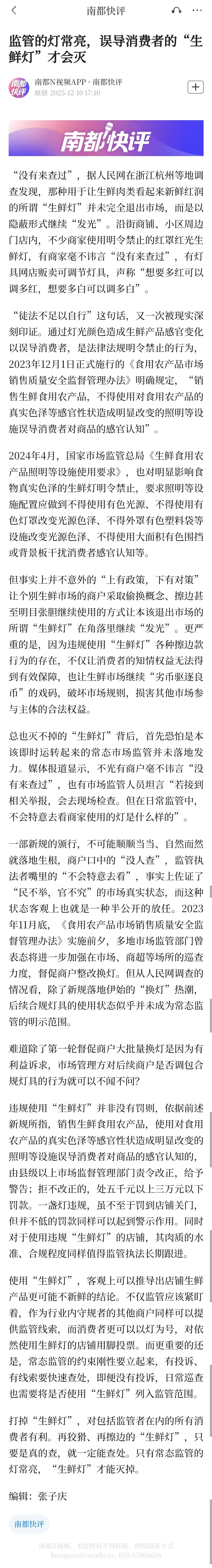 #生鲜灯灭不掉背后是监管无力#【南都快评:监管的灯常亮,误导消费者的“生鲜灯”才会灭】#商家说没有人查生鲜灯##生鲜灯并未退出市场#“没有来查过”,据人民网在浙江杭州等地调查发现,那种用于让生鲜肉类看起来新鲜红润的所谓“生鲜灯”并未完全退出市场,而是以隐蔽形式继续“发光”。沿街商铺、小区周边门店内,不少商家使用明令禁止的红罩红光生鲜灯,有商家毫不讳言“没有来查过”,有灯具网店贩卖可调节灯具,声称“想要多红可以调多红,想要多白可以调多白”。“徒法不足以自行”这句话,又一次被现实深刻印证。通过灯光颜色造成生鲜产品感官变化以误导消费者,是法律法规明令禁止的行为,2023年12月1日正式施行的《食用农产品市场销售质量安全监督管理办法》明确规定,“销售生鲜食用农产品,不得使用对食用农产品的真实色泽等感官性状造成明显改变的照明等设施误导消费者对商品的感官认知”。总也灭不掉的“生鲜灯”背后,首先恐怕是本该即时运转起来的常态市场监管并未落地发力。媒体报道显示,不光有商户毫不讳言“没有来查过”,也有市场监管人员坦言“若接到相关举报,会去现场检查。但在日常监管中,不会特意去看商家使用的灯是什么样的”。一部新规的颁行,不可能顺顺当当、自然而然就落地生根,商户口中的“没人查”,监管执法者嘴里的“不会特意去看”,事实上佐证了“民不举,官不究”的市场真实状态,而这种状态客观上也就是一种半公开的放任。2023年11月底,《食用农产品市场销售质量安全监督管理办法》实施前夕,多地市场监管部门曾表态将进一步加强在市场、商超等场所的巡查力度,督促商户整改换灯。但从人民网调查的情况看,除了新规落地伊始的“换灯”热潮,后续合规灯具的使用状态似乎并未成为常态监管的明示范围。难道除了第一轮督促商户大批量换灯是因为有利益诉求,市场管理方对后续商户是否调包合规灯具的行为就可以不闻不问?违规使用“生鲜灯”并非没有罚则,依据前述新规所指,销售生鲜食用农产品,使用对食用农产品的真实色泽等感官性状造成明显改变的照明等设施误导消费者对商品的感官认知的,由县级以上市场监督管理部门责令改正,给予警告;拒不改正的,处五千元以上三万元以下罚款。一盏灯违规,虽不至于罚到店铺关门,但并不低的罚款同样可以起到警示作用。同时对于使用违规“生鲜灯”的店铺,其肉质的水准、合规程度同样值得监管执法长期跟进。使用“生鲜灯”,客观上可以推导出店铺生鲜产品更可能不新鲜的结论。不仅监管应该紧盯着,作为行业内守规者的其他商户同样可以提供监管线索,而消费者更可以以灯为号,对依然使用生鲜灯的店铺用脚投票。而更重要的还是,常态监管的约束刚性要立起来,有投诉、有线索要快速查处,即便没有投诉,日常巡查也需要将是否使用“生鲜灯”列入监管范围。打掉“生鲜灯”,对包括监管者在内的所有消费者有利。再狡猾、再擦边的“生鲜灯”,只要是真的查,就一定能查处。只有常态监管的灯常亮,“生鲜灯”才能灭掉。