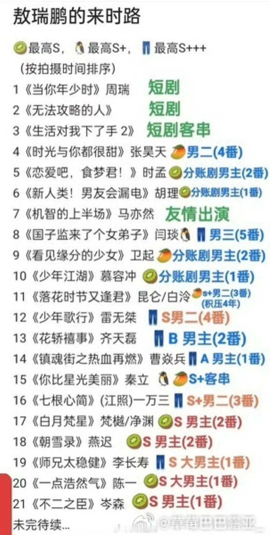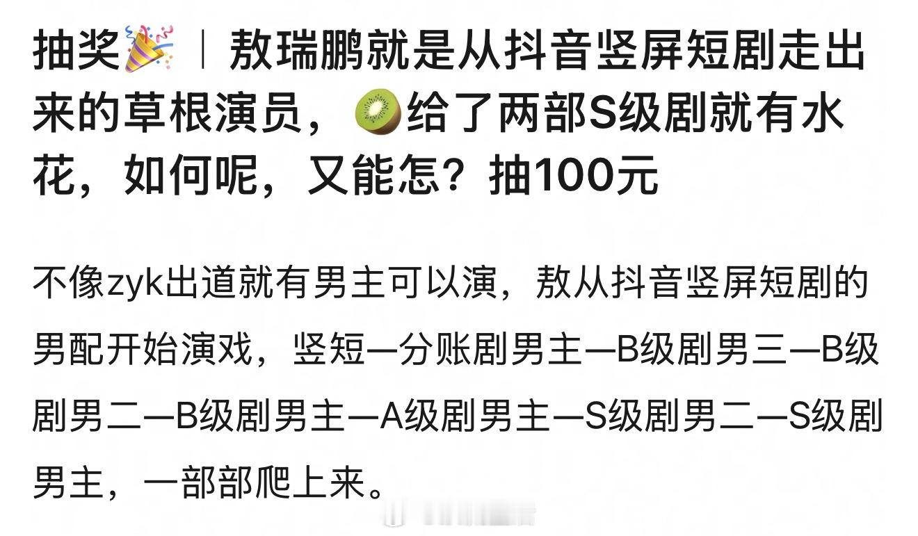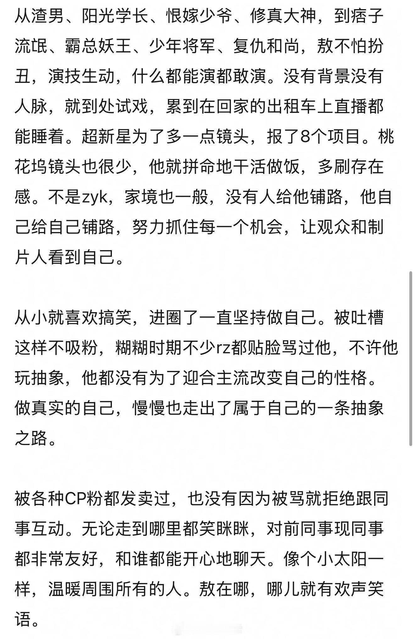 粉丝投稿敖瑞鹏的来时路,从短剧、分账剧到长剧,从男配演到男主,没有zyk的天降,只有小演员的一路打拼。我的感受是他演戏信念感很强,代入感强,而且实事求是地讲,颜值在线,演技不错,被看好很正常。