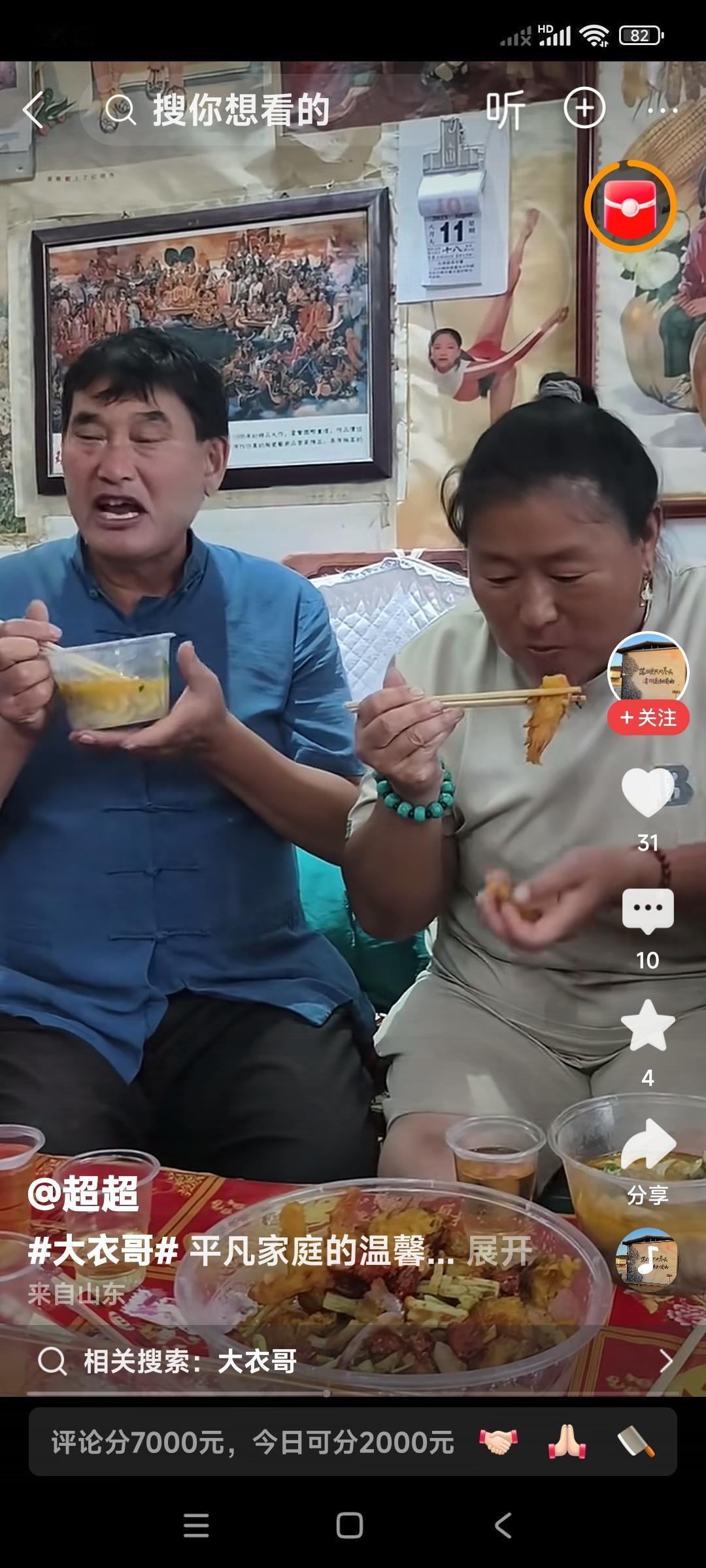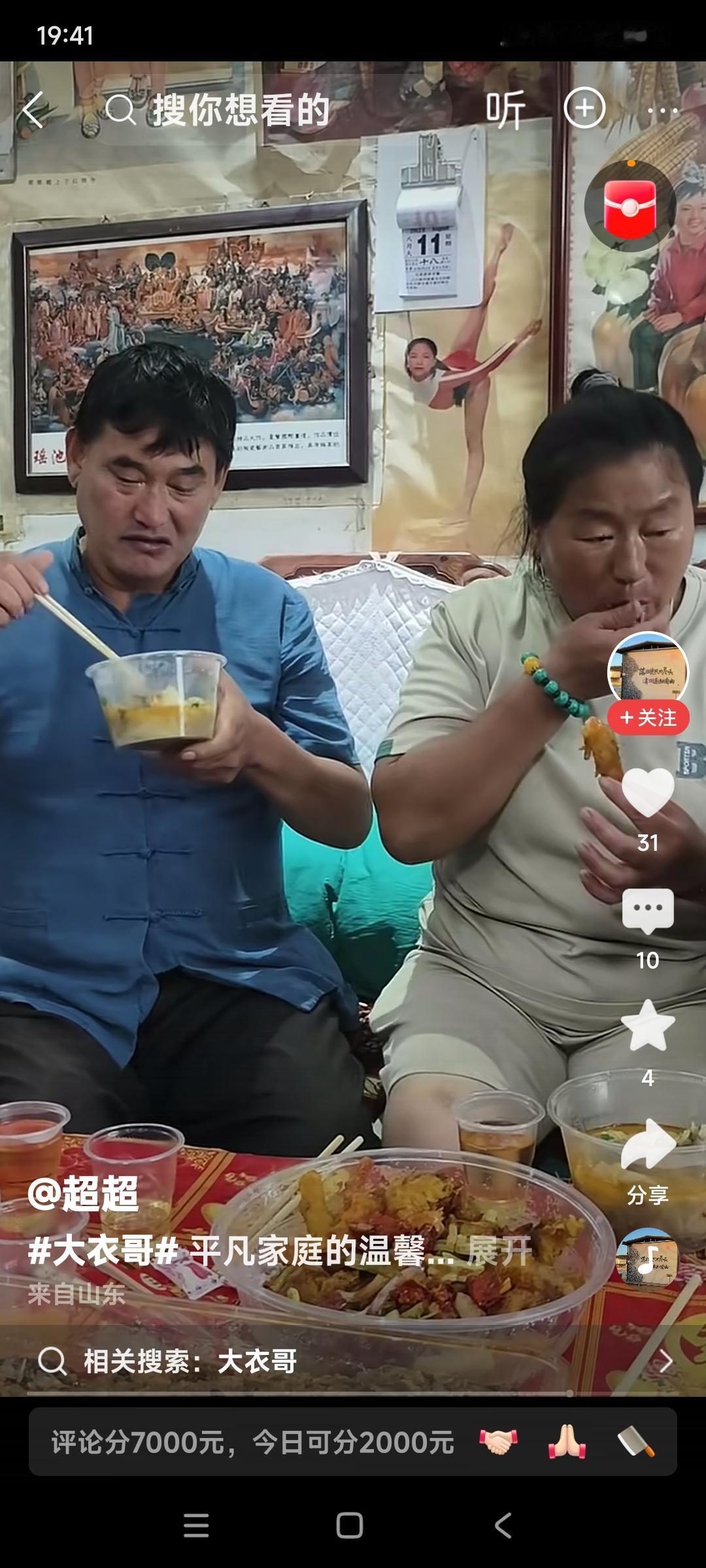 看看大衣哥大衣嫂两口子吃饭的画面。 大衣嫂夹了个大虾,往嘴里头送。 大衣哥端着塑料盆儿一直不撂筷子。 瞅着两口子就是平常这饭菜都吃得这么香。 (大虾在他们家属于平常饭) 大衣哥吃的挺胸叠肚。 大衣嫂吃的是肥头大耳。 这两口子真能吃。