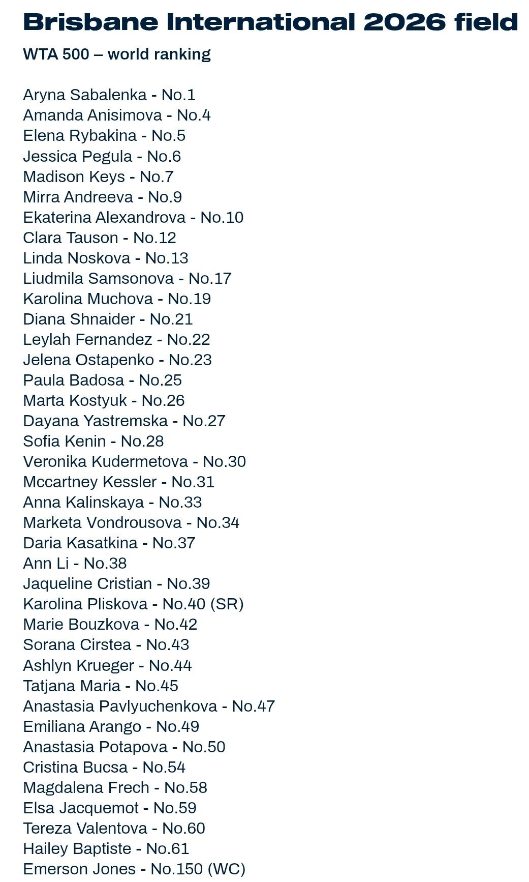WTA500布里斯班站公布参赛阵容🎙 世界第一、卫冕冠军萨巴伦卡领衔,另外六位TOP10选手阿尼西莫娃、莱巴金娜、佩古拉、凯斯、米拉·安德列娃、亚历山德洛娃在列,三届赛会冠军卡·普利斯科娃也将亮相。这项500赛将在1月4日-11日进行。