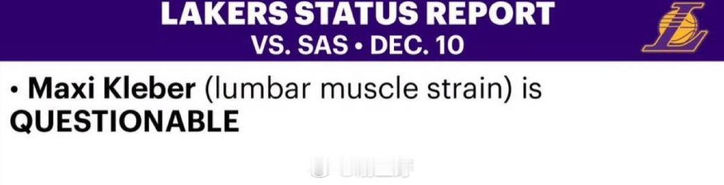 湖人队的伤病报告真让人笑掉大牙!今天,湖人队官方公布了明天对阵马刺队的伤病报告,全队仅一个人伤病,不是41岁的詹姆斯,不是背部痉挛的斯玛特,也不是伤病报告常客文森特,而是克勒贝尔,他因腰部肌肉拉伤出战成疑。这伤病报告真的让人忍俊不禁。克勒贝尔自从伤愈复出后几乎没有多少上场时间,但依旧小毛小病不断,没打比赛也能受伤,真让人无可奈何。幸好克勒贝尔只是边缘角色球员,除了他之外全员健康,伤缺六场的斯玛特也火线复出。明天的NBA杯淘汰赛,湖人队抱着必胜晋级的决心!