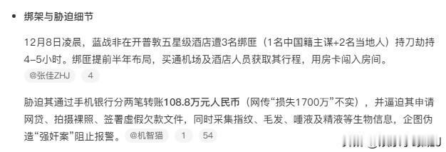 108万,的确是华人能干出来的事,还追求个吉利数字,好恐怖。。在外居然要防的是国人。。好可悲 ,这个钱对于他来说算是花钱买了条命,最重要是的是他的精神受到了很大的伤害…… 有时候想想,银行的大额转账限制对于自身的财产守护还是挺不错的。