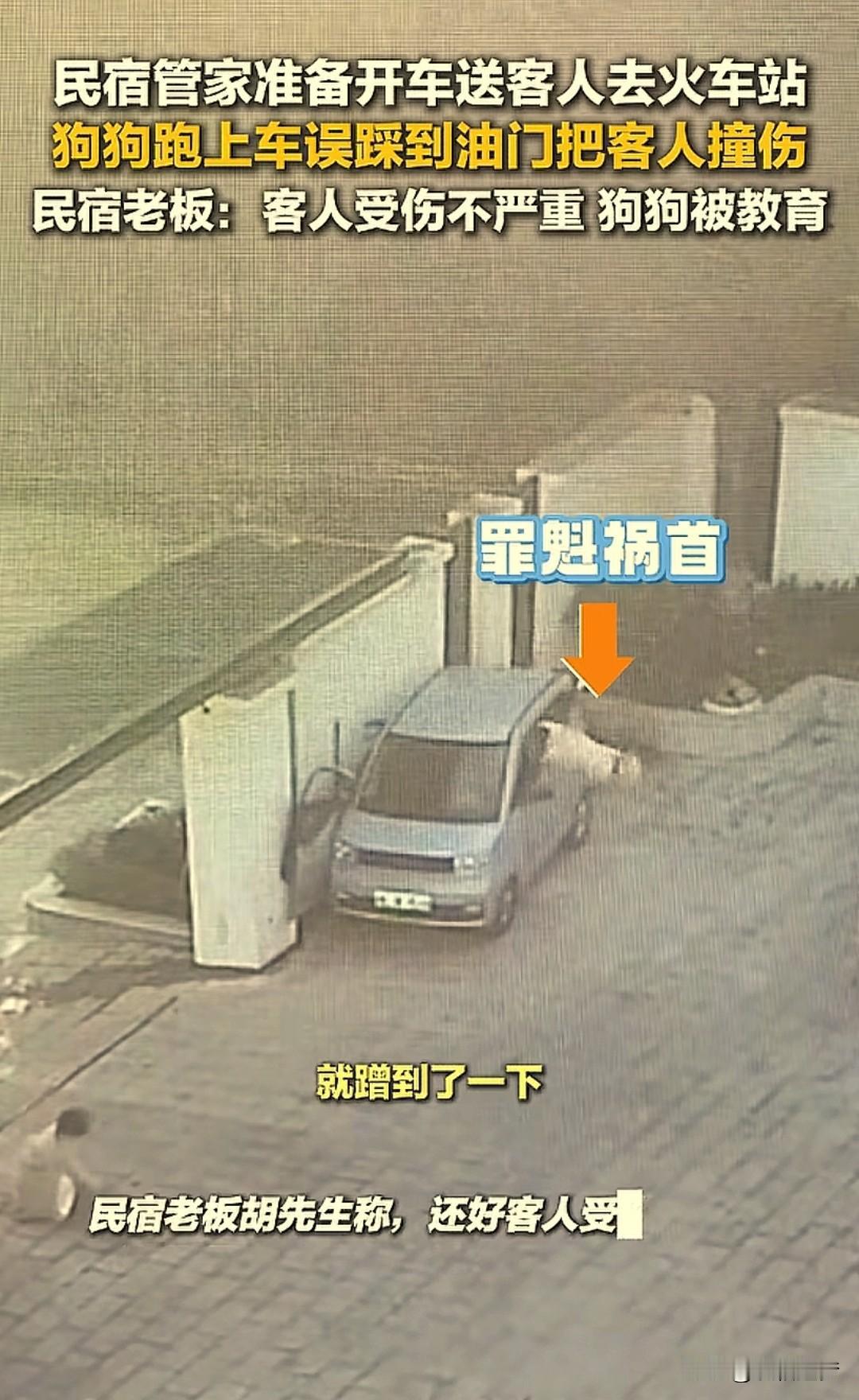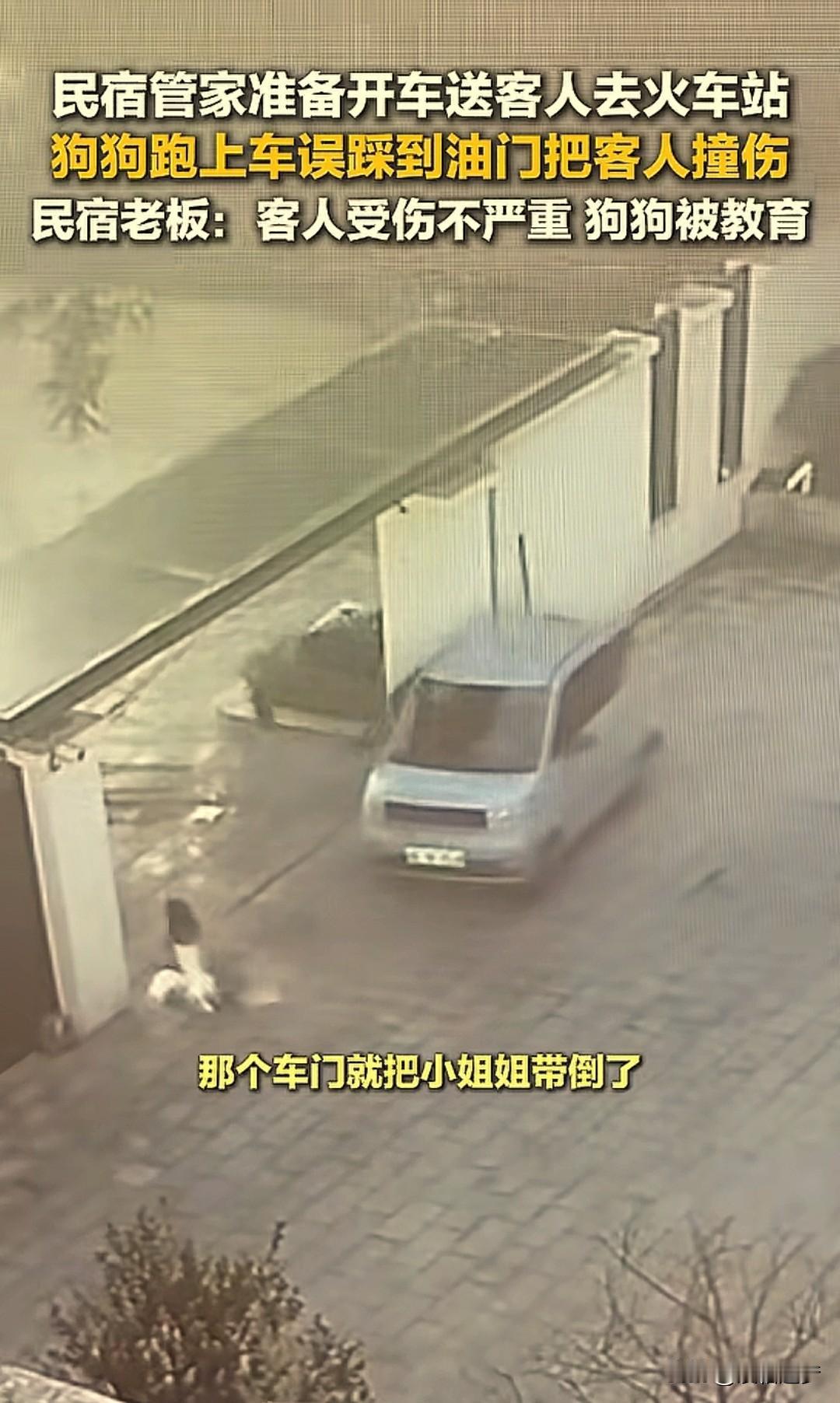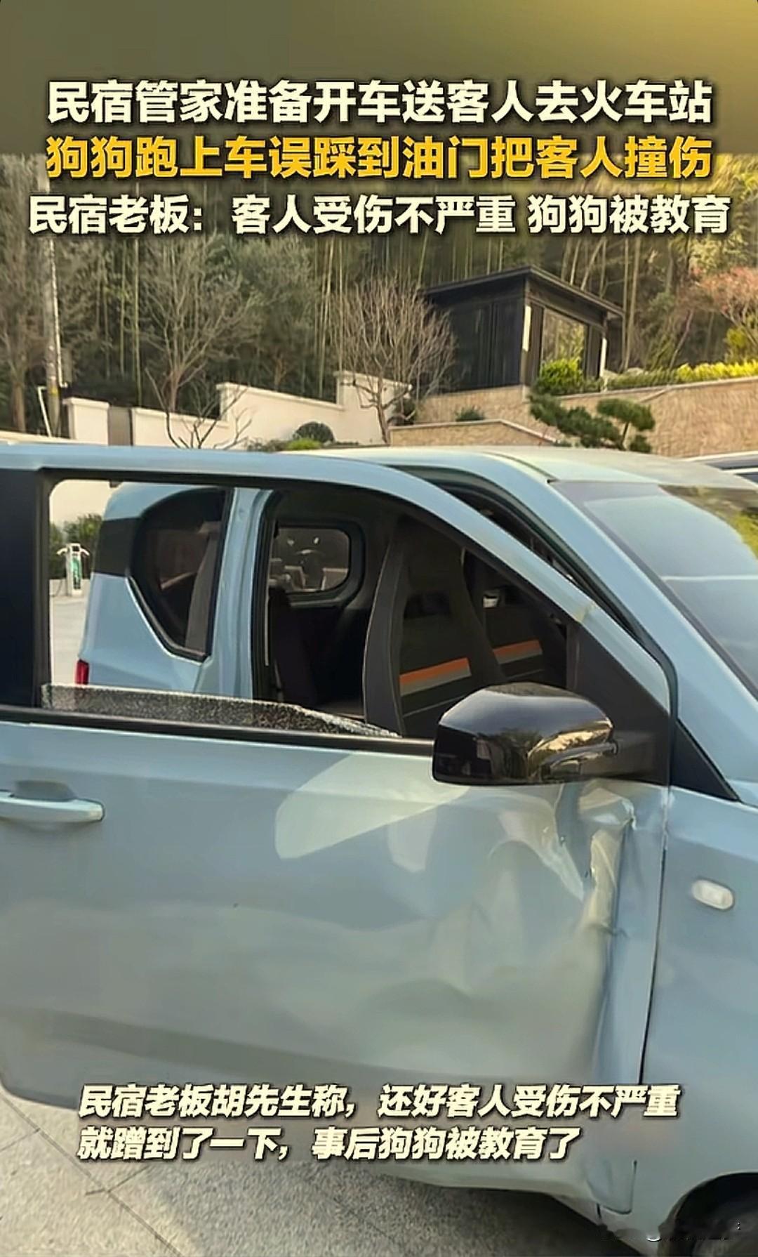 “这祸闯大了!”浙江,两女子搭民宿车去高铁站,刚要上车,院子里的狗狗突然蹿出,坐上了副驾驶,众人还没反应过来,狗狗又跳上了主驾驶,一脚油门发动了车子,直接把车门撞断了,附近的女子也被刮倒在地。 都说狗狗调皮,平时小打小闹也就算了,这次居然捅这么大的篓子。 根据荔枝新闻12月10日报道,这件离谱又让人哭笑不得的事,就发生在一家民宿院里。 店主透露,两名女客人因为早起要赶高铁,怕她们来不及,就让管家开着自家的小车把客人送过去。 管家把车子启动后打开了车门,一名客人刚上了车,家里的狗狗顺着墙根悄悄跑了过去,“嗖”的一下顺着打开的车门冲上了副驾驶,这还不算,车里的管家还没反应过来,狗狗又跳到了主驾驶室,一脚踩在了油门上,车子猛的向后倒了过去。 站在车门旁边女客人猝不及防,被没来得及关上的车门刮倒,紧接着,车门又刮到了大门垛上,反方向贴在了墙上,可能是车里管家反应过来,及时踩了刹车,这才没撞到后面的花坛。 而狗狗也知道闯了祸,车一停,顺着主驾驶车窗跳了出去没影了。整个过程不过十几秒钟,等管家和客人反应过来后,赶紧下车查看地上的女客人。 庆幸的是,三人都没什么大事,只是车门断了。事后店家赶紧赶到了现场,对客人致歉,至于狗狗,直接拴起来挨了一顿打! 这事真是又离谱又好笑,说真的,看着是乐子带着搞笑,其实细想还挺后怕的。万幸人没啥大事,只是真的挺吓人的!这要是车速再快一点,或者撞到别的东西,那后果可就不堪设想了。 这管家也是心大,没考虑家里狗狗顽皮,放松了警惕,没想到敞着车门竟然被狗狗钻了空子。 这狗狗估计平时上车都习惯了,闯了祸就跑,典型的熊孩子行为,挨顿揍一点不冤!