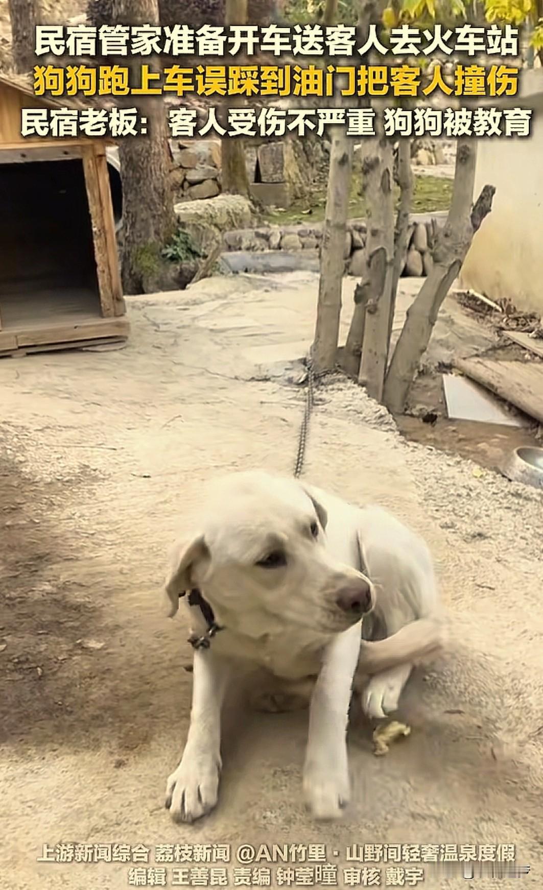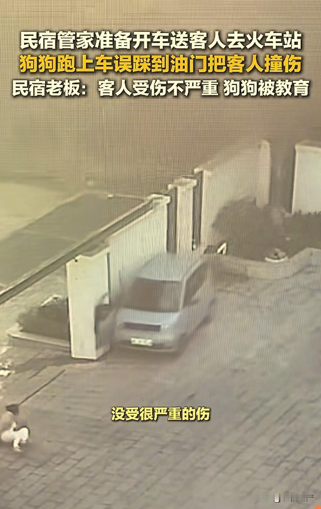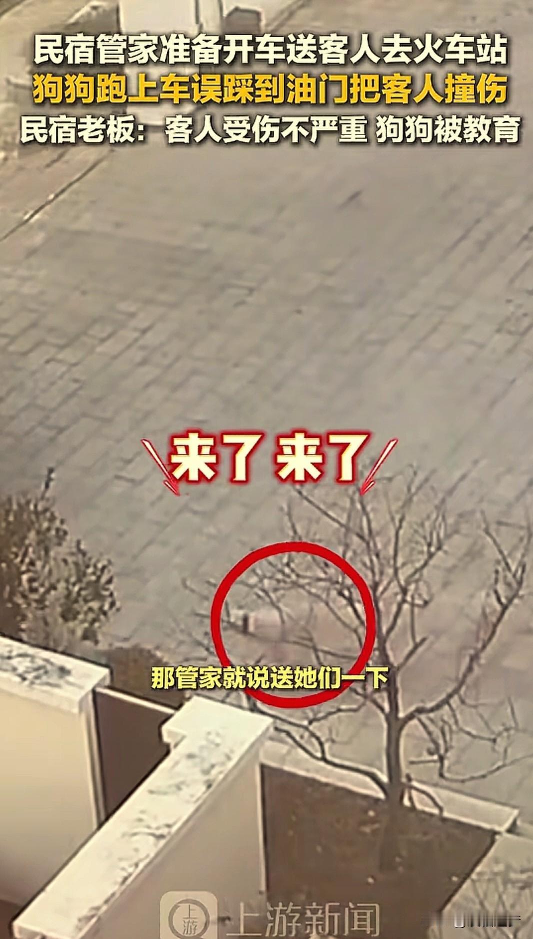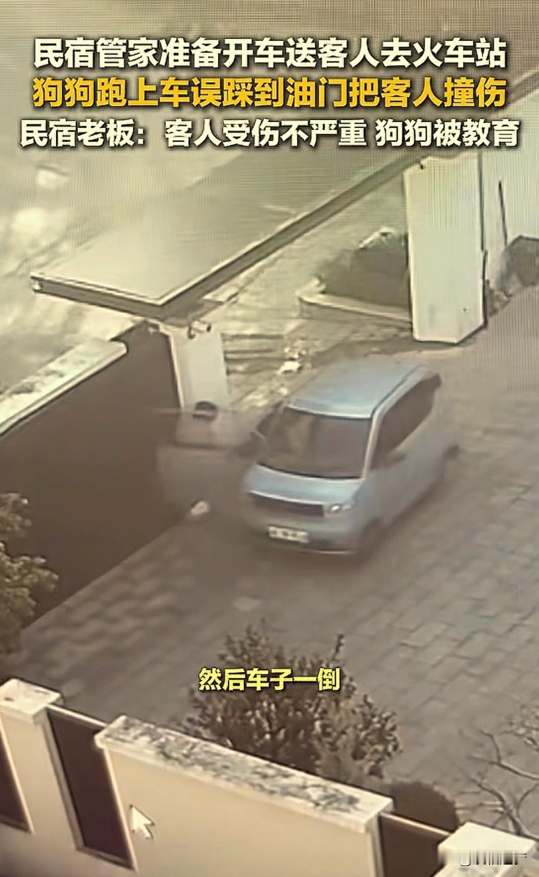 “这祸闯大了!”浙江,两女子搭民宿车去高铁站,刚要上车,院子里的狗狗突然蹿出,坐上了副驾驶,众人还没反应过来,狗狗又跳上了主驾驶,一脚油门发动了车子,直接把车门撞断了,附近的女子也被刮倒在地。 都说狗狗调皮,平时小打小闹也就算了,这次居然捅这么大的篓子。 根据荔枝新闻12月10日报道,这件离谱又让人哭笑不得的事,就发生在一家民宿院里。 店主透露,两名女客人因为早起要赶高铁,怕她们来不及,就让管家开着自家的小车把客人送过去。 管家把车子启动后打开了车门,一名客人刚上了车,家里的狗狗顺着墙根悄悄跑了过去,“嗖”的一下顺着打开的车门冲上了副驾驶,这还不算,车里的管家还没反应过来,狗狗又跳到了主驾驶室,一脚踩在了油门上,车子猛的向后倒了过去。 站在车门旁边女客人猝不及防,被没来得及关上的车门刮倒,紧接着,车门又刮到了大门垛上,反方向贴在了墙上,可能是车里管家反应过来,及时踩了刹车,这才没撞到后面的花坛。 而狗狗也知道闯了祸,车一停,顺着主驾驶车窗跳了出去没影了。整个过程不过十几秒钟,等管家和客人反应过来后,赶紧下车查看地上的女客人。 庆幸的是,三人都没什么大事,只是车门断了。事后店家赶紧赶到了现场,对客人致歉,至于狗狗,直接拴起来挨了一顿打! 这事真是又离谱又好笑,说真的,看着是乐子带着搞笑,其实细想还挺后怕的。万幸人没啥大事,只是真的挺吓人的!这要是车速再快一点,或者撞到别的东西,那后果可就不堪设想了。 这管家也是心大,没考虑家里狗狗顽皮,放松了警惕,没想到敞着车门竟然被狗狗钻了空子。 这狗狗估计平时上车都习惯了,闯了祸就跑,典型的熊孩子行为,挨顿揍一点不冤!