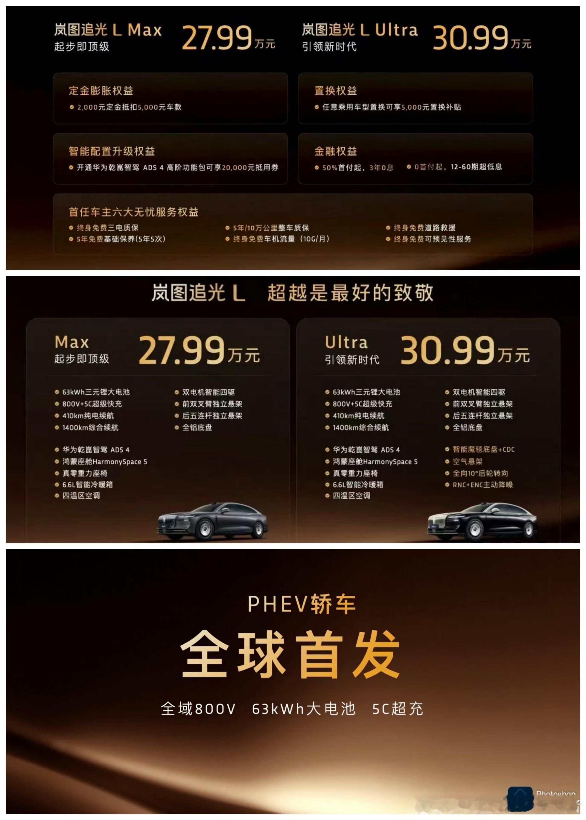 岚图追光L,63度三元锂电池的混动车,标配华为乾崑ADS 4辅助驾驶和5C超充,410km纯电续航。。。现在是越来越离谱了,发动机完全成为了后备隐藏能源了。不过,27.99万至30.99要这个价格倒是不贵,大家觉得怎么样?