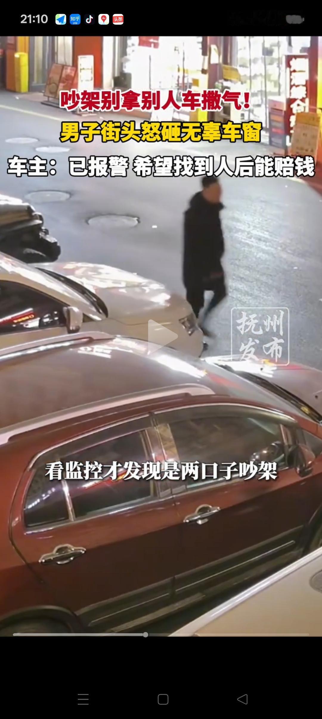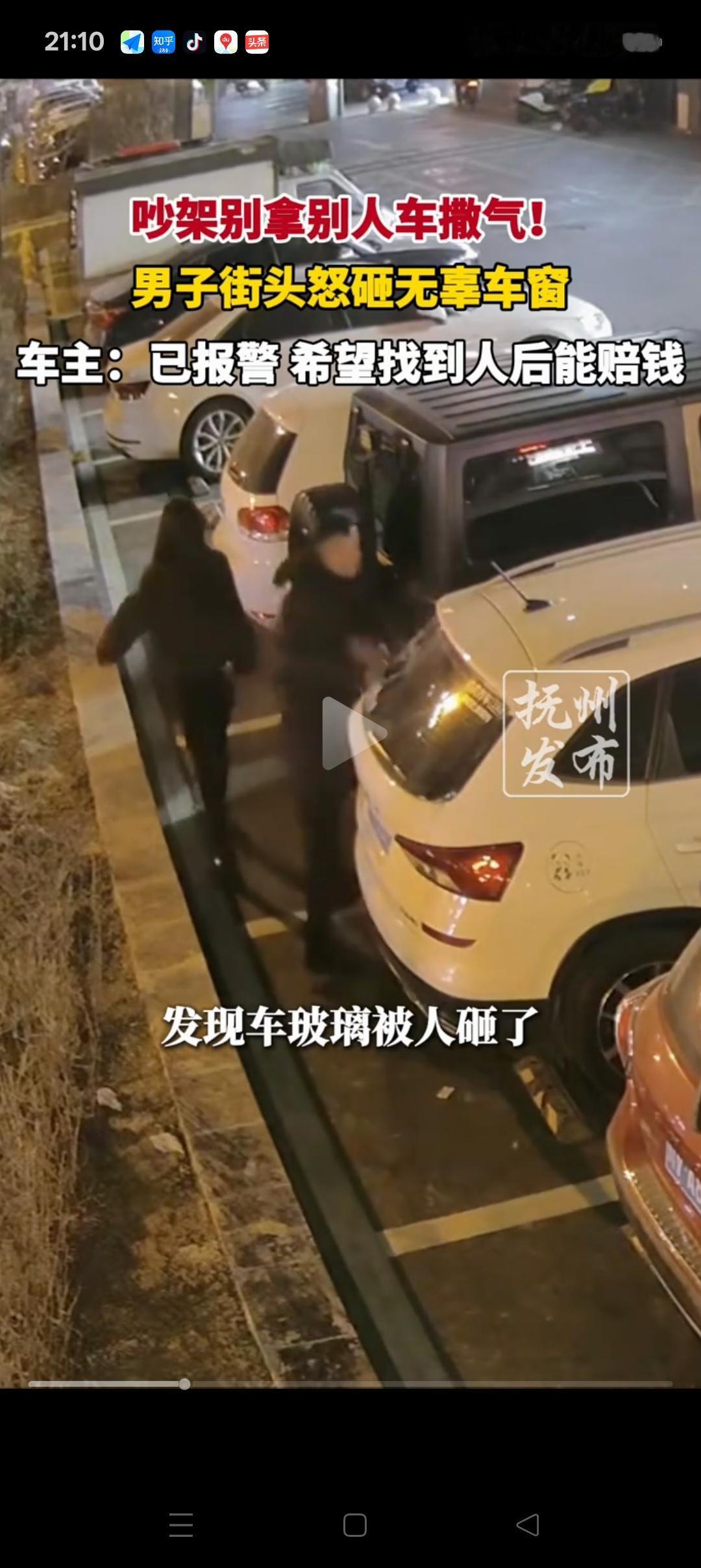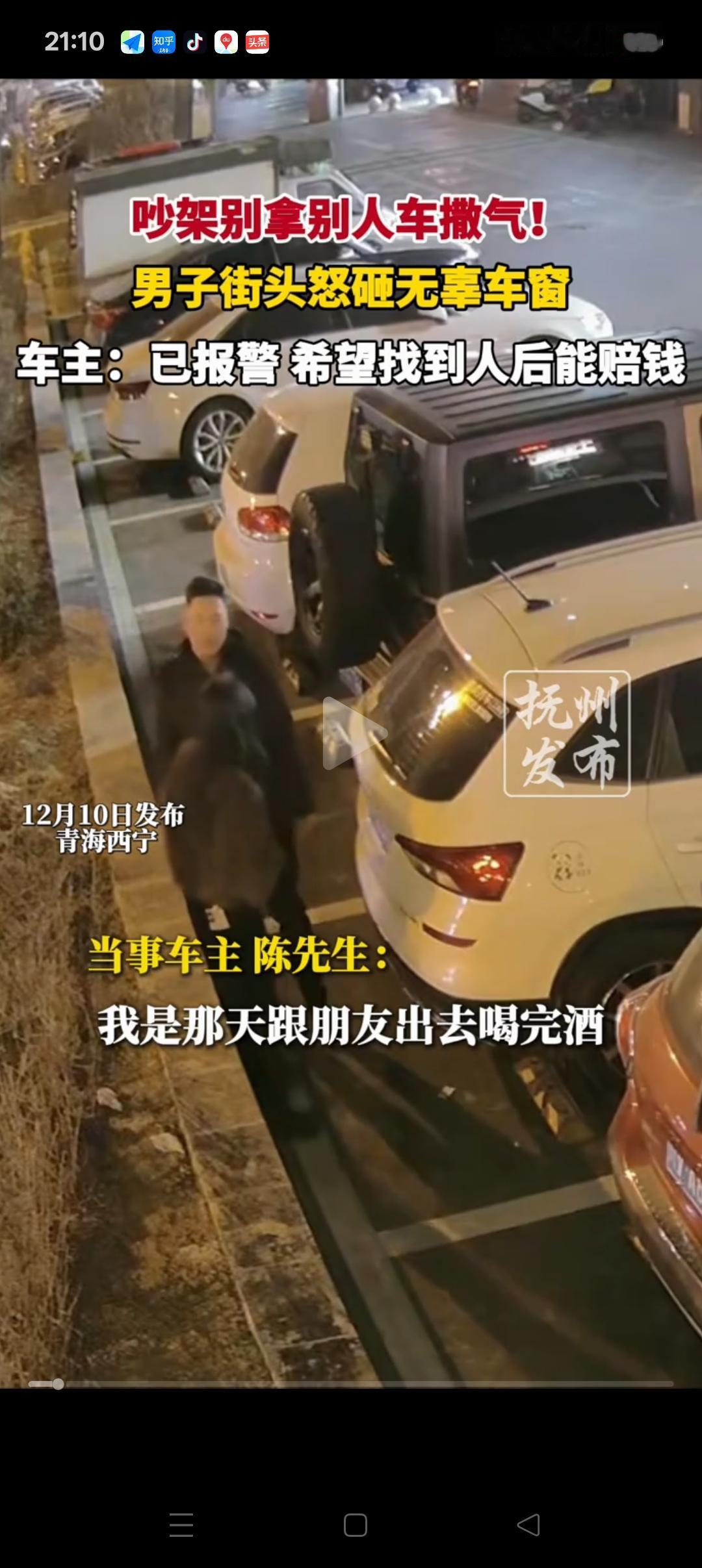 “这手没事吧[笑哭]?”,青海,一男子因和女朋友吵架,一拳就把身边的车玻璃干碎了,便扬长而去!车主无奈的说:你们吵架就吵架,砸我的车干啥? 记得年轻时和老婆吵架,也是一时没忍住,就一拳打在了树上。当时还没感觉到疼,直到后来才发现骨折了,疼了几个月[捂脸] 这个男的不说别的,素质还是有,在生气也是有底线的,只砸车,不打女朋友。但建议他去检查一下手,就算不骨折,也会肿的很厉害。 也不知道当时他们吵啥,男的会这么生气?你们应该也有这种经历吧。。