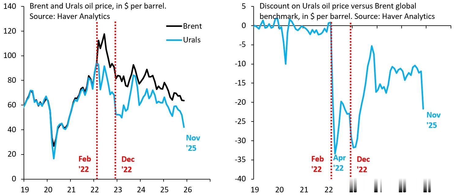 美国智库欢庆俄油比布伦特原油低,认为制裁挺有用。好吧,欧洲吃不着,印度也不太敢买太多了,还得补点美气对冲。但对东大来说,谢谢对岸的兄弟啊。* 美国对俄罗斯石油公司和卢克石油公司的制裁导致乌拉尔原油价格相对于布伦特原油价格大幅下跌(左图)。* 11 月份乌拉尔原油的折价幅度几乎比 10 月份翻了一番,目前约为每桶 22 美元(右图)。