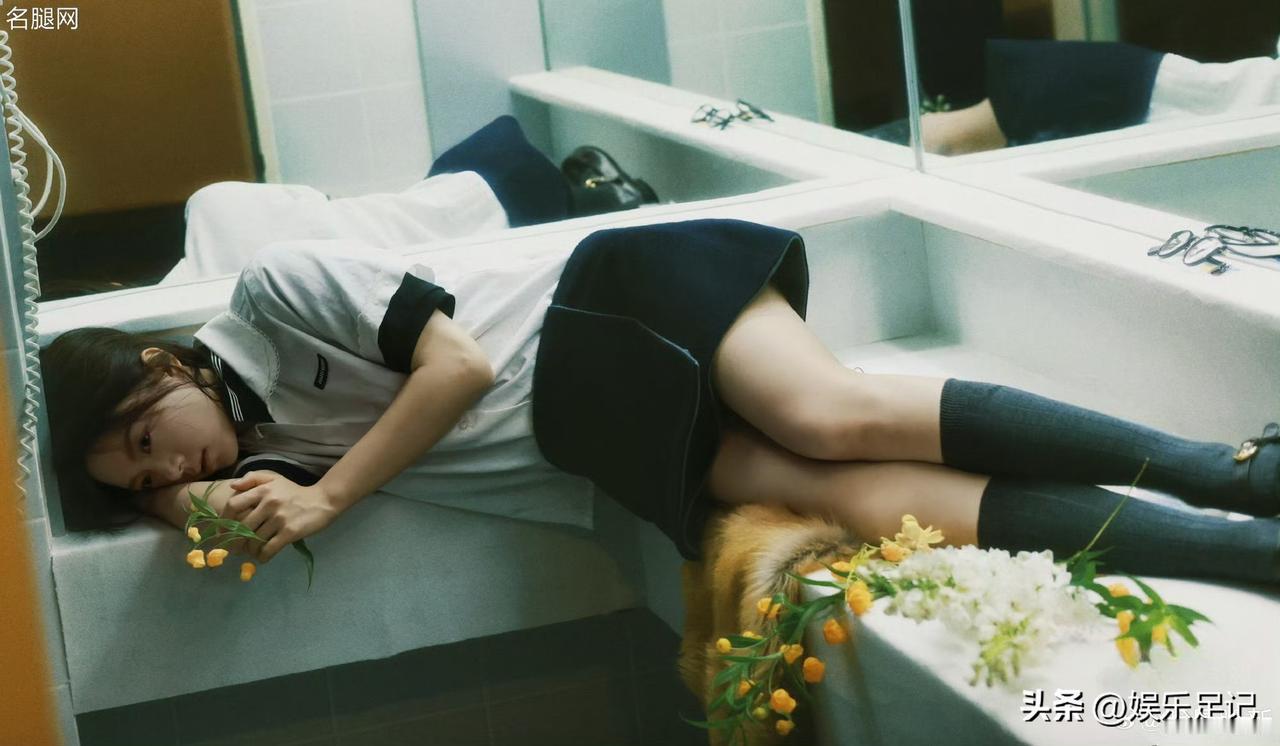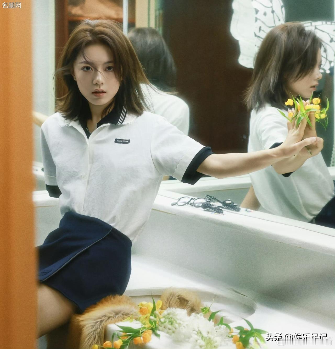 赵今麦甜美脸庞搭配海军领短袖,过膝袜下的美腿线条匀称