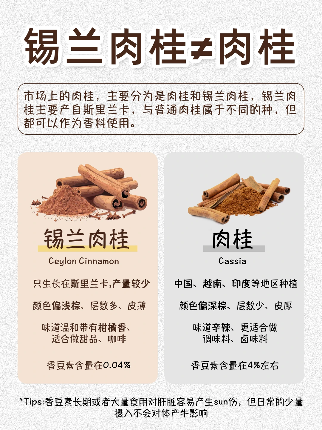 但你知道吗?肉桂粉其实分为两种:锡兰肉桂粉(Ceylon Cinnamon)和普通肉桂粉(Cassia Cinnamon)!这两者可完全不同呢~
