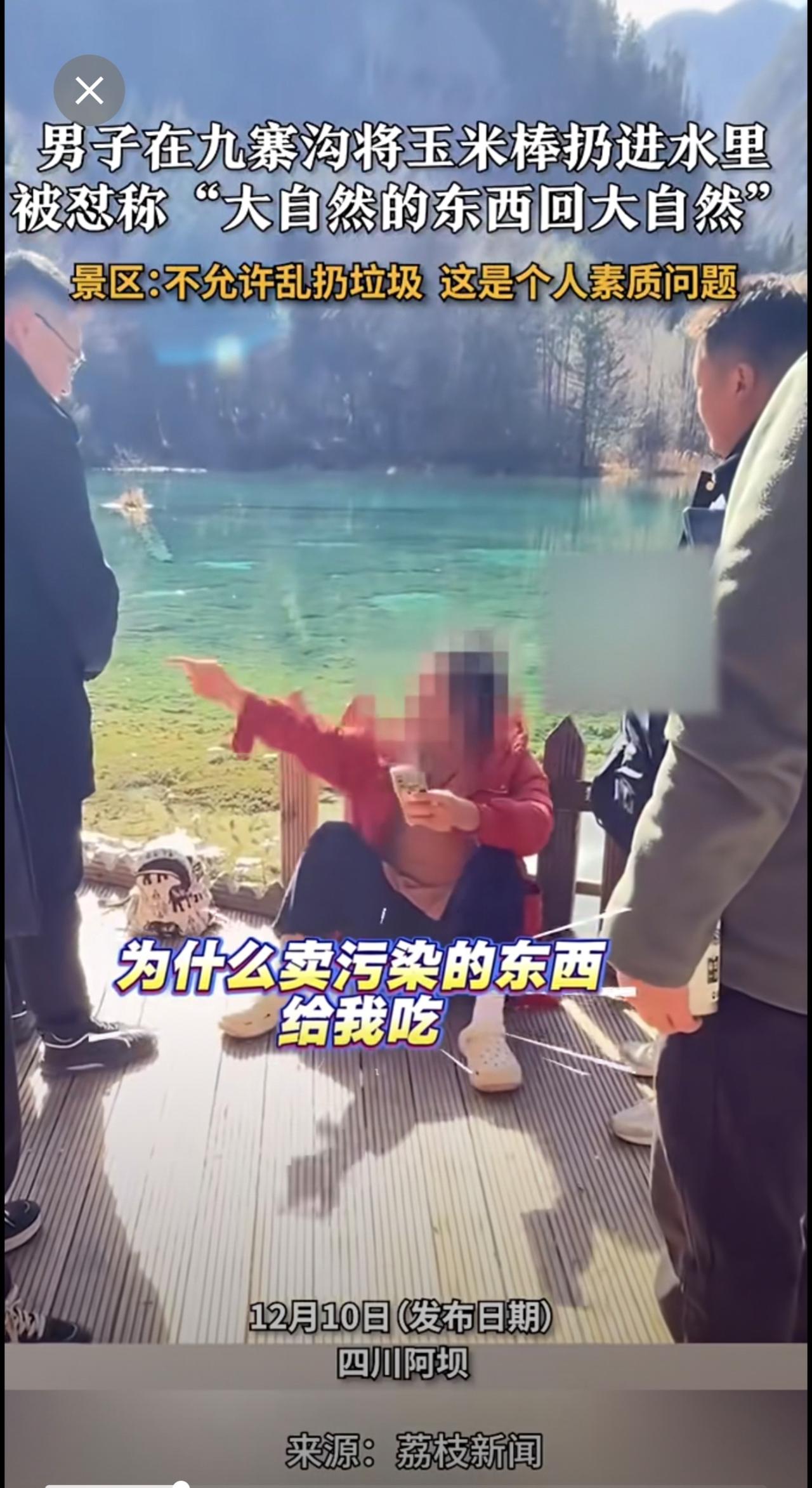 【#九寨沟景区回应男子把剩玉米扔水里#】12月10日,四川阿坝,一男子把吃剩下的