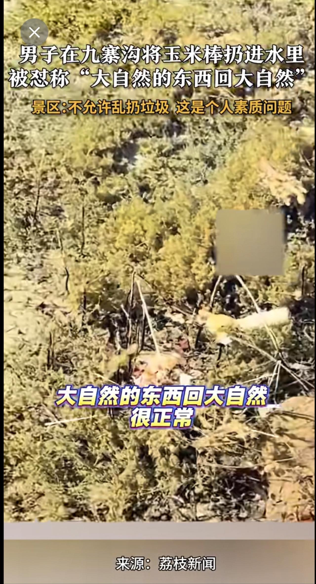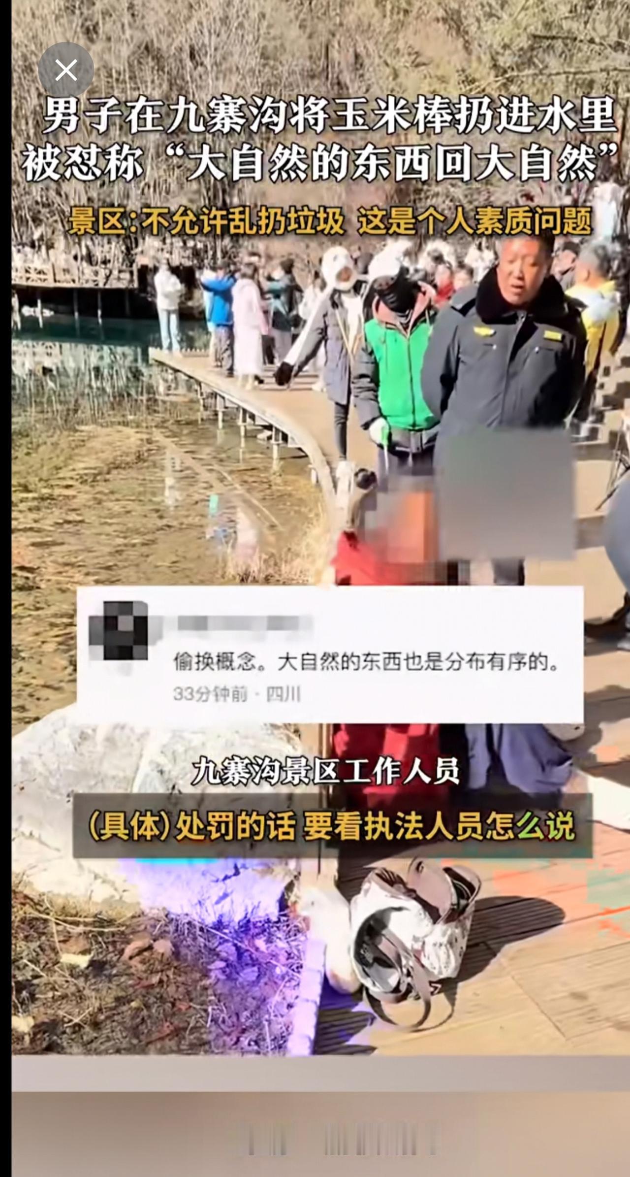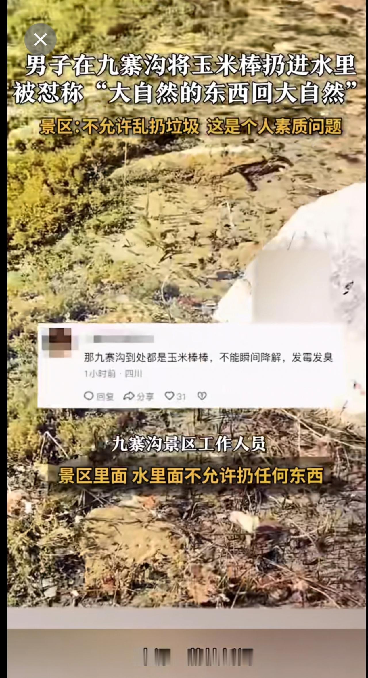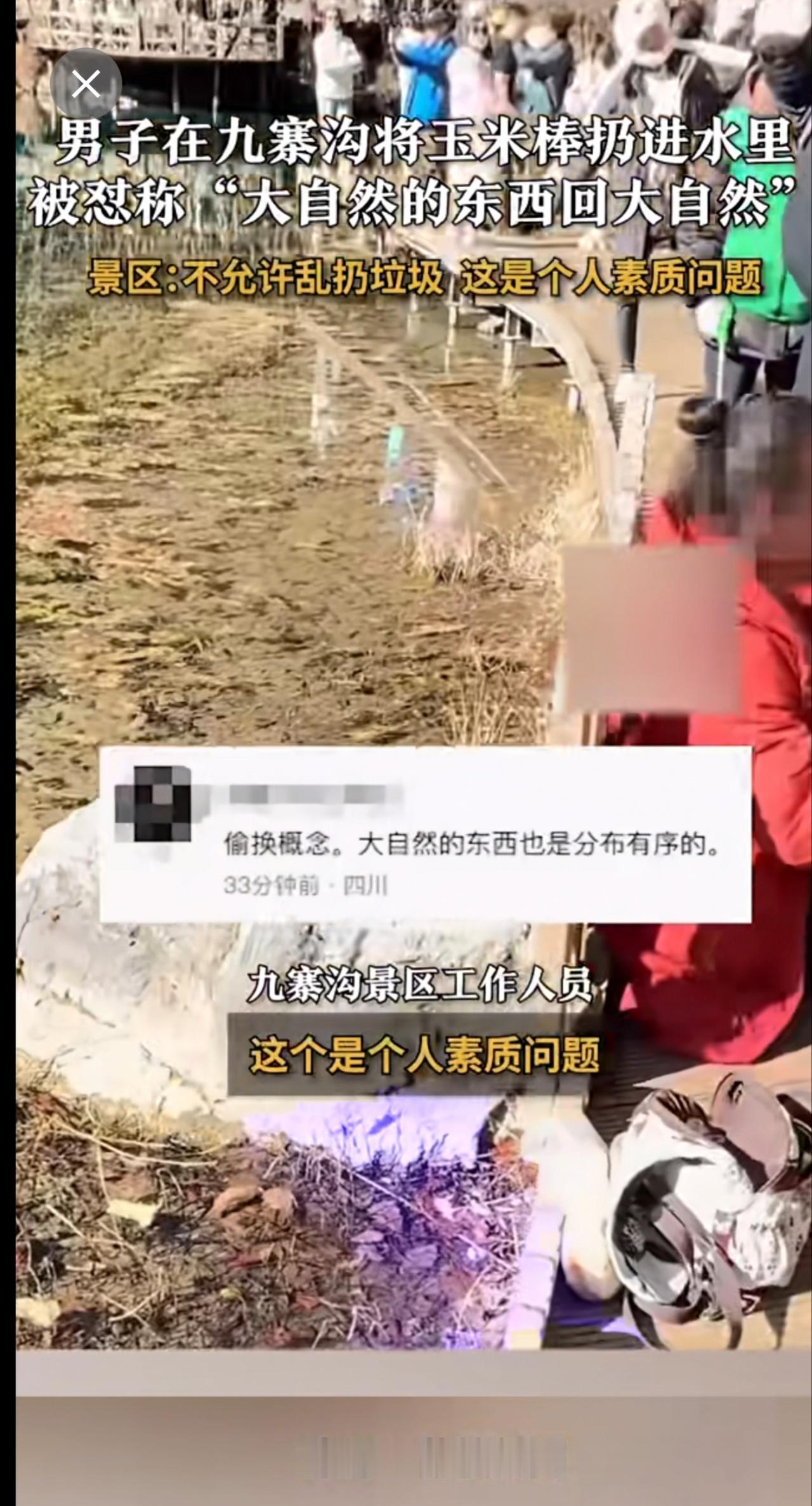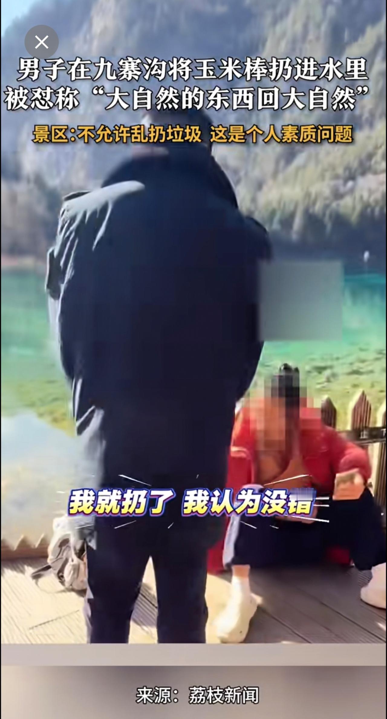 男子在九寨沟将玉米棒扔进水里被怼称“大自然的东西回大自然”景区:不允许乱扔