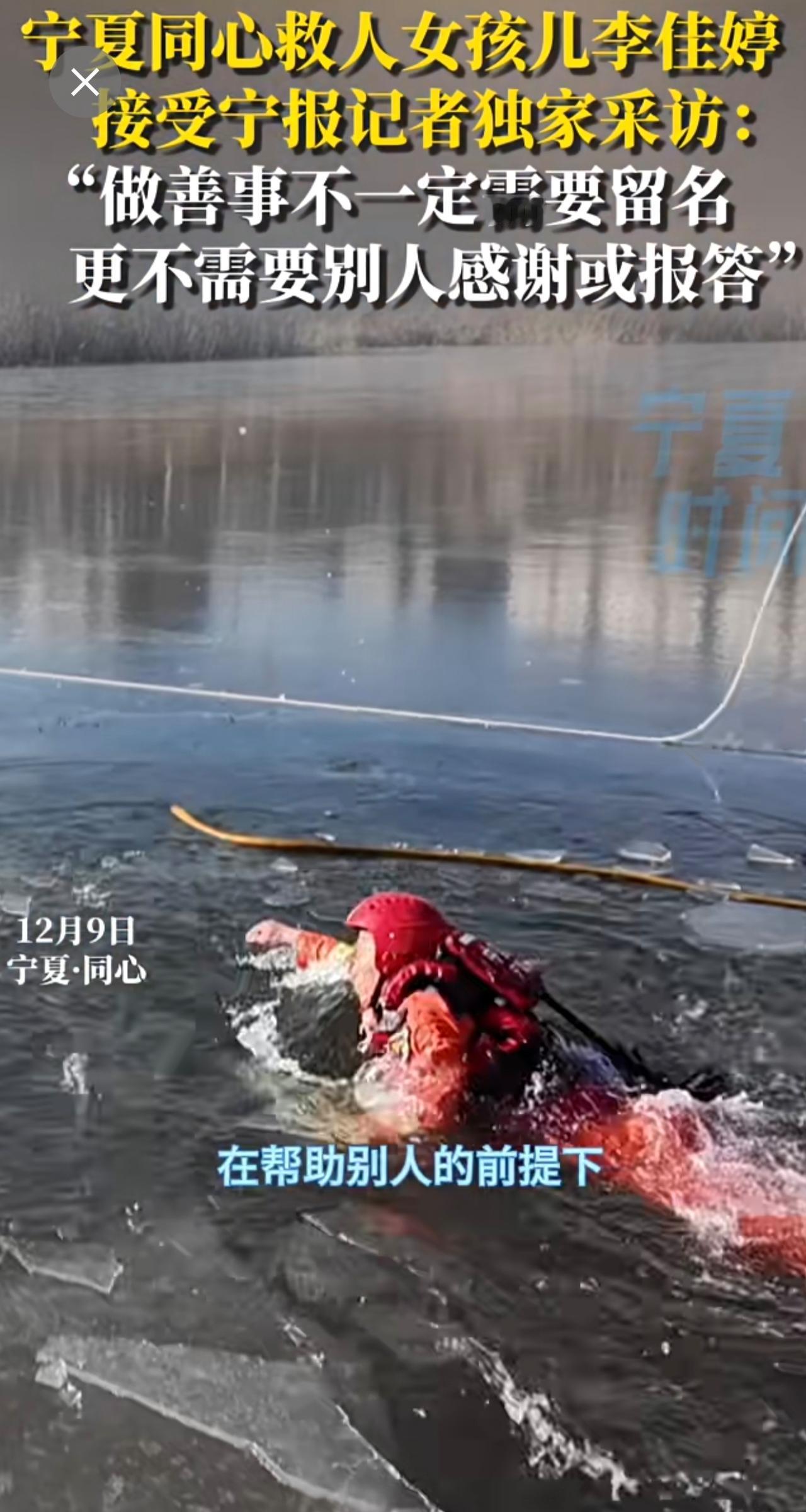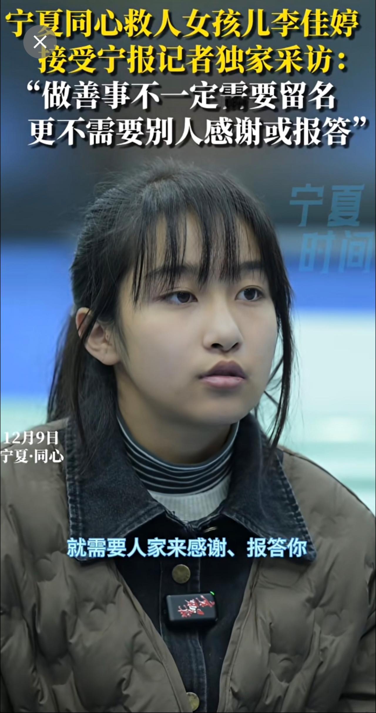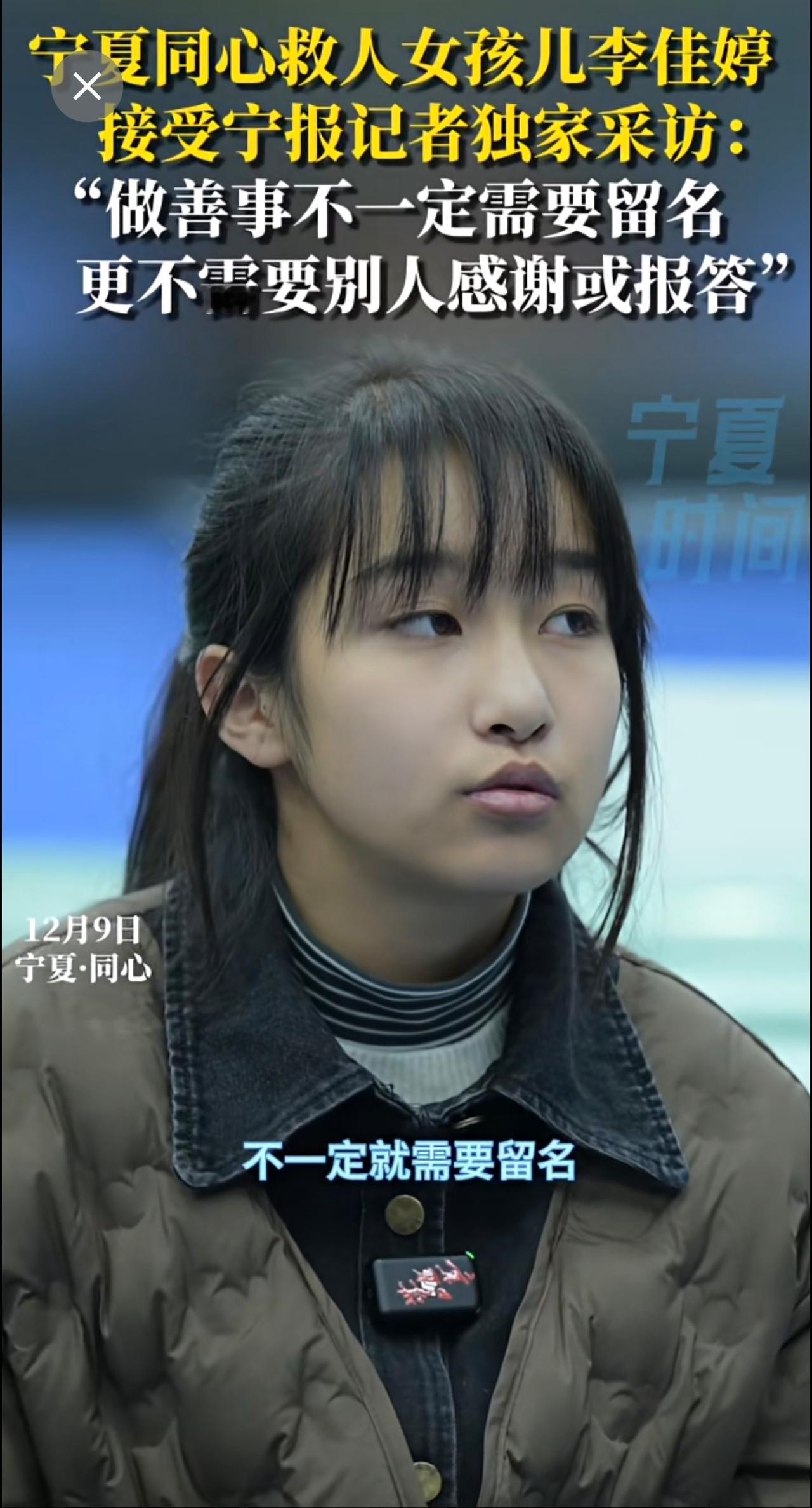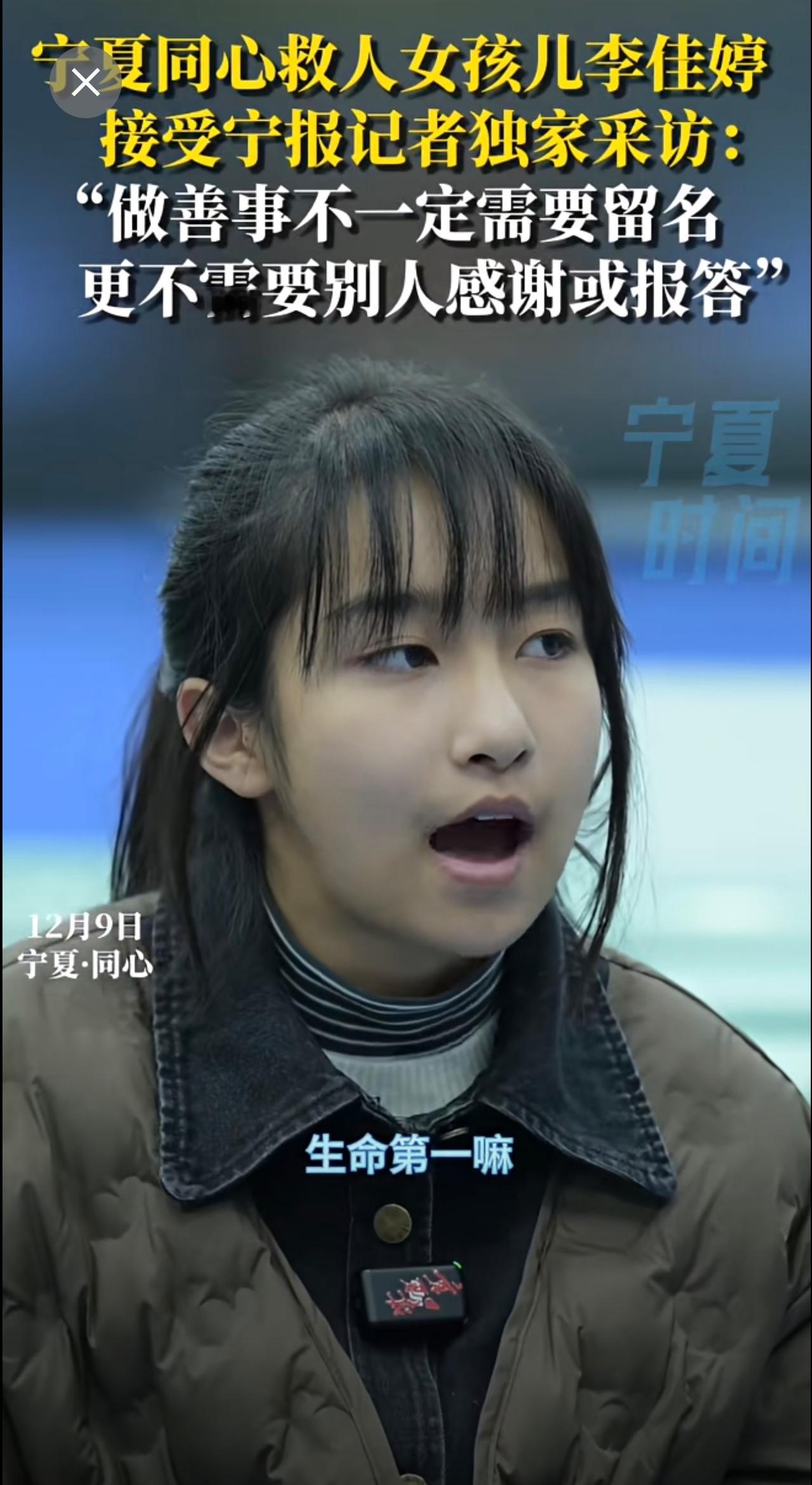 “做善事不一定需要留名,更不需要别人感谢或报答。”12月9日,宁夏同心那位勇敢救人的女孩李佳婷,在接受专访时多次坚定地说出了这句话。她说,生命安全第一,自己能挽救一个生命,内心里充满成就感,这就足够了,不需要别人感谢。 (来源:宁夏时间)