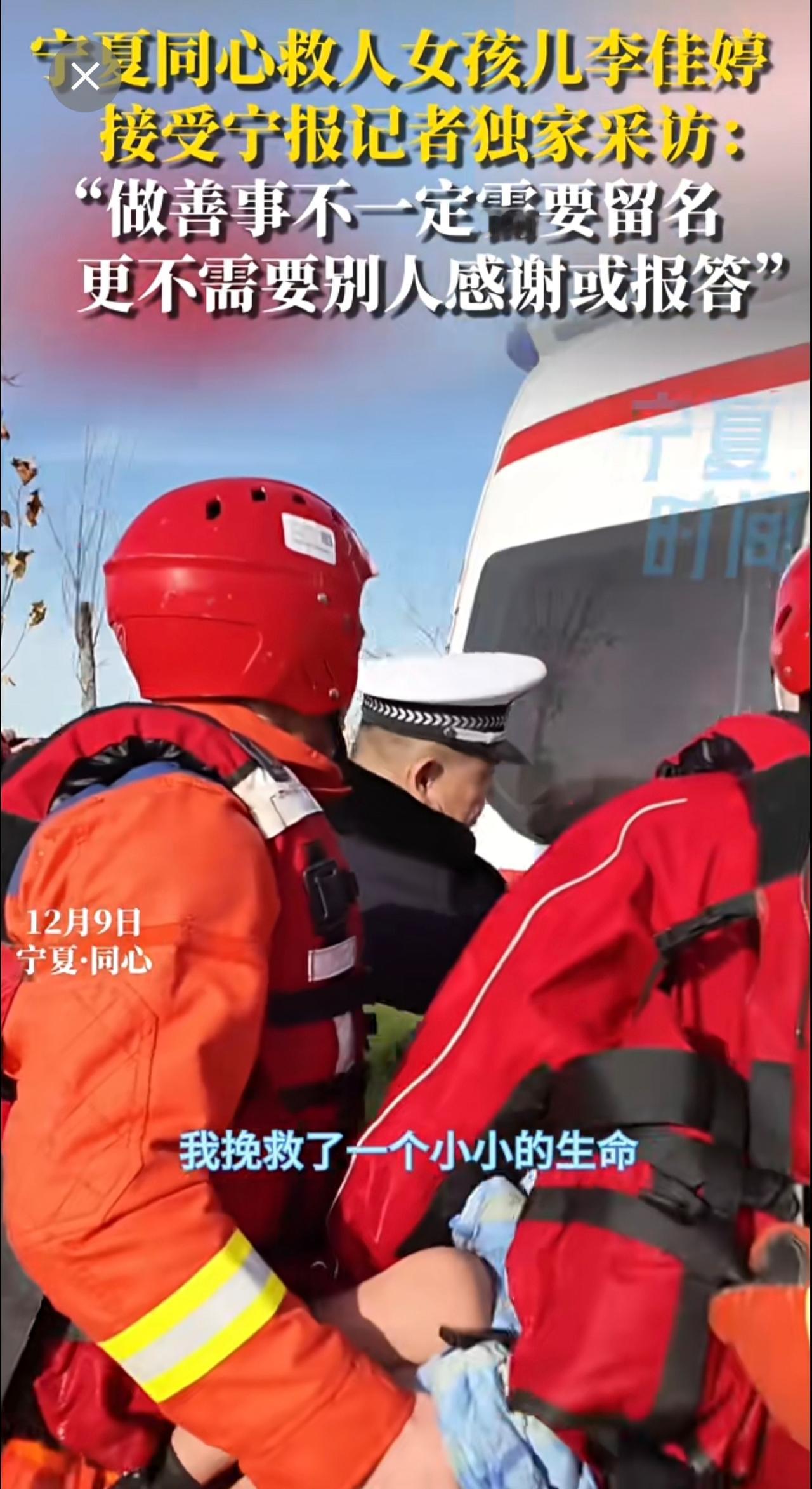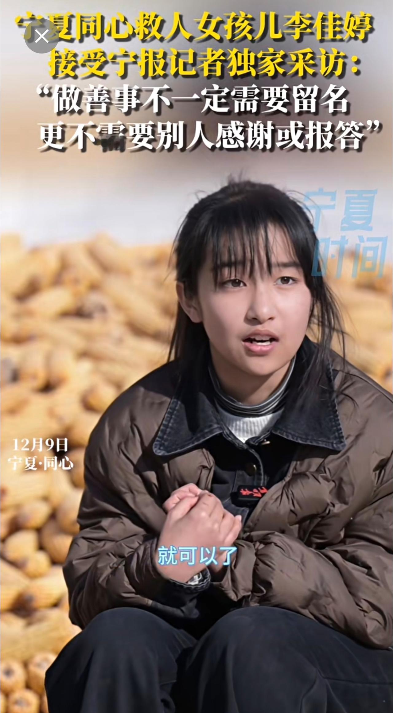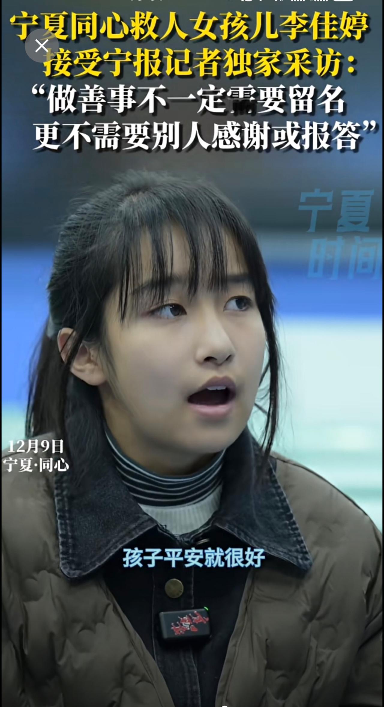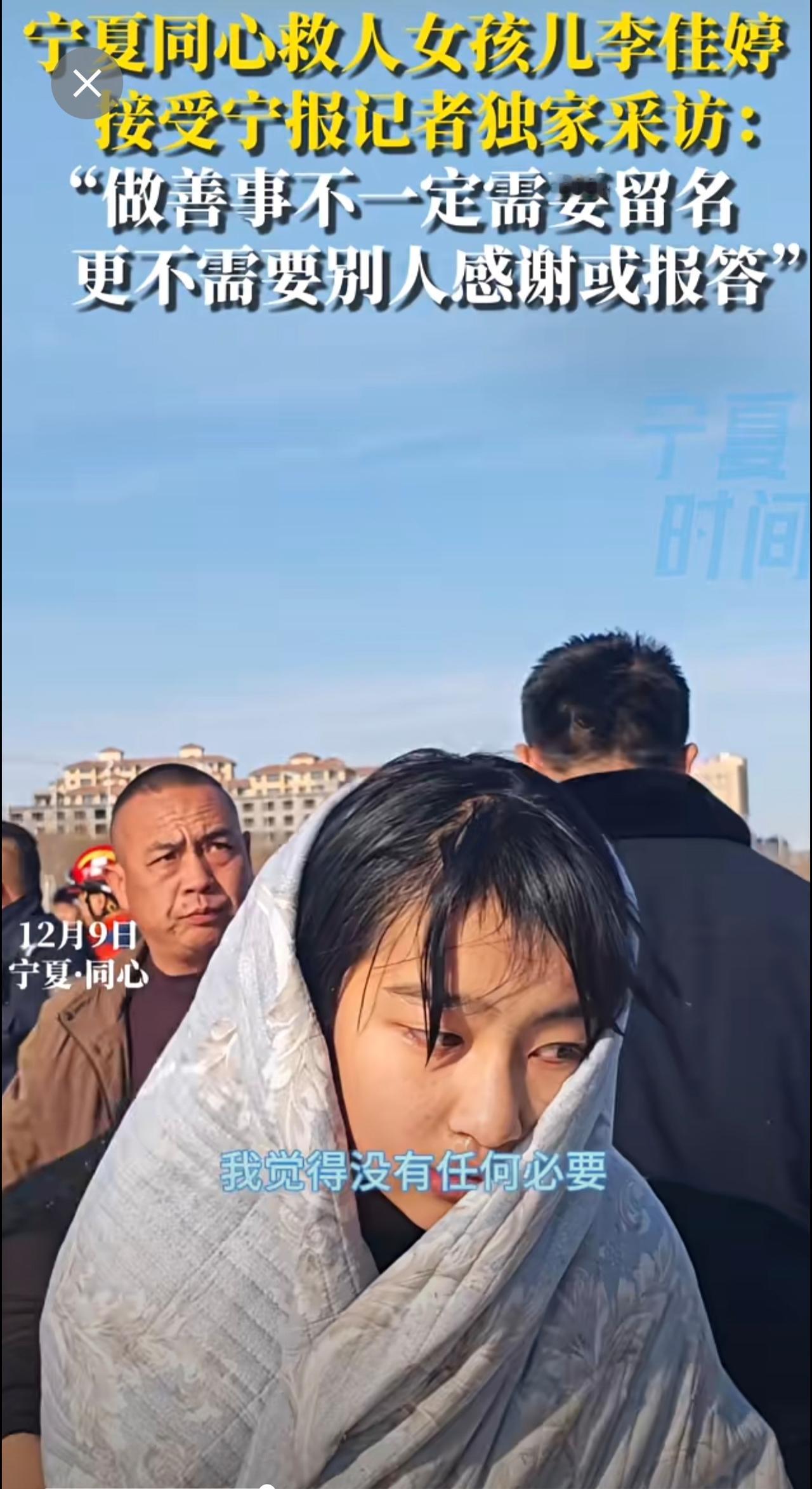 “做善事不一定需要留名,更不需要别人感谢或报答。”12月9日,宁夏同心那位勇敢救人的女孩李佳婷,在接受专访时多次坚定地说出了这句话。她说,生命安全第一,自己能挽救一个生命,内心里充满成就感,这就足够了,不需要别人感谢。 (来源:宁夏时间)