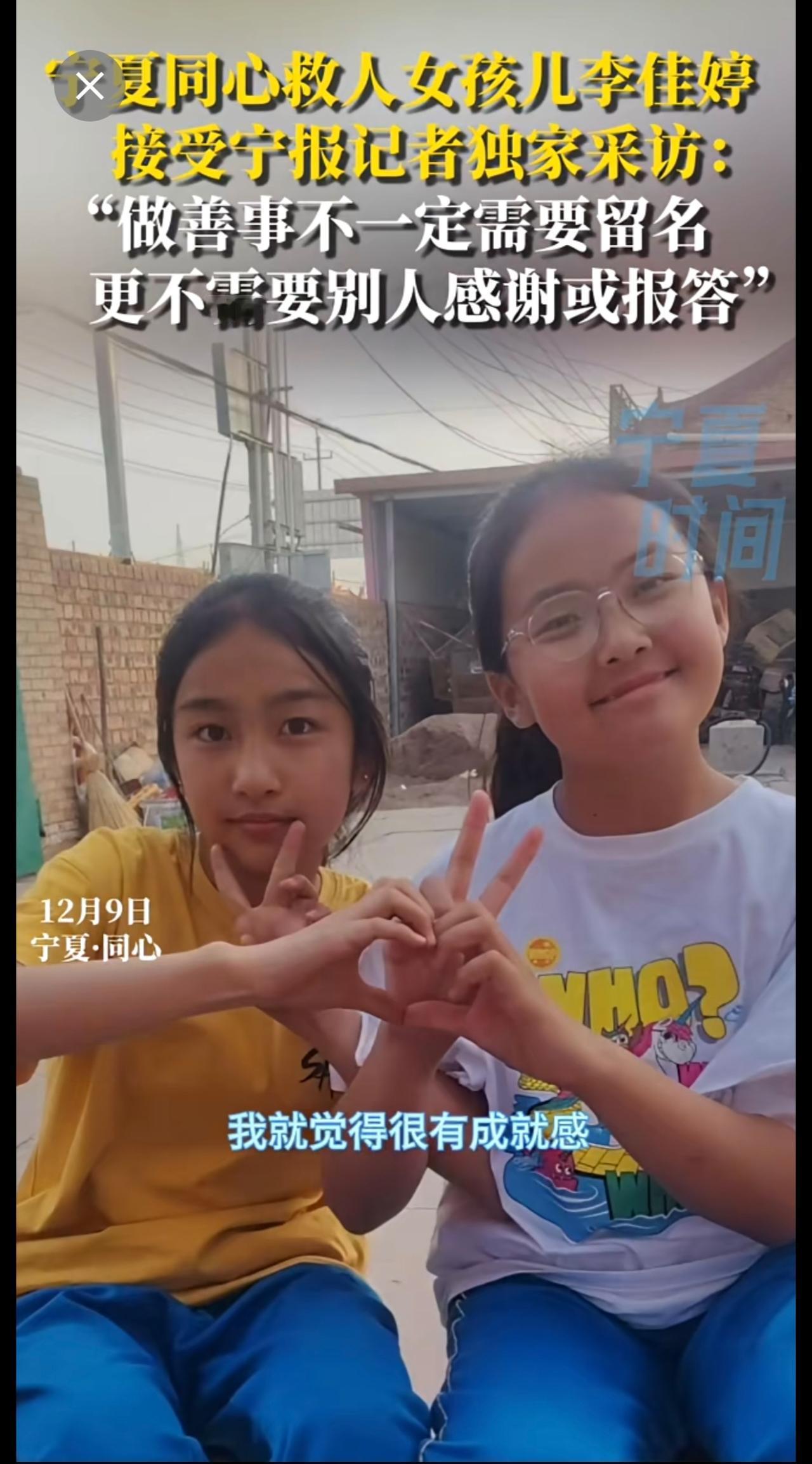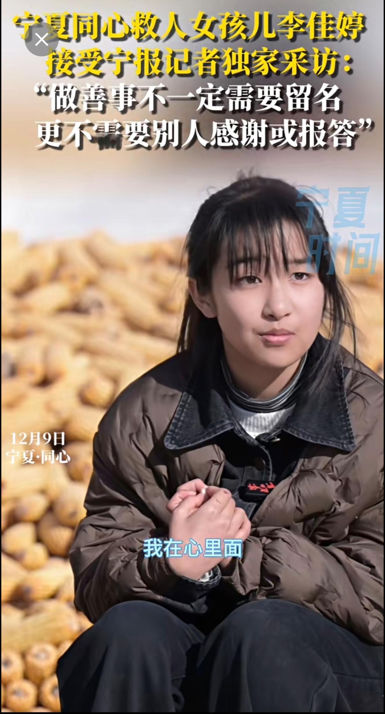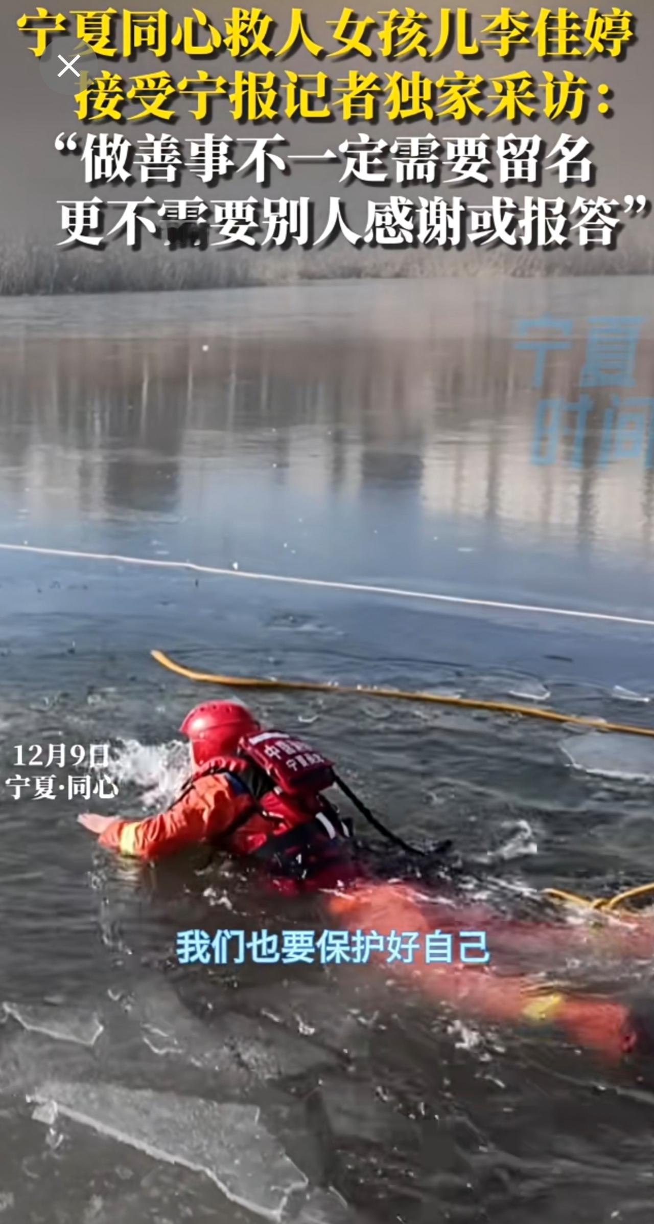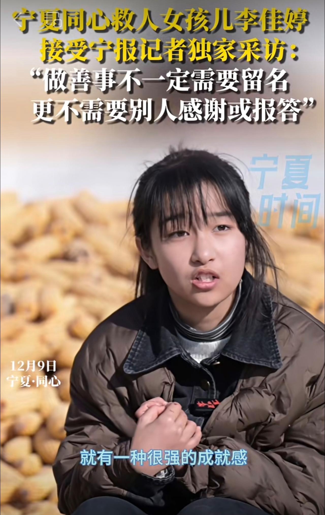 “做善事不一定需要留名,更不需要别人感谢或报答。”12月9日,宁夏同心那位勇敢救人的女孩李佳婷,在接受专访时多次坚定地说出了这句话。她说,生命安全第一,自己能挽救一个生命,内心里充满成就感,这就足够了,不需要别人感谢。 (来源:宁夏时间)