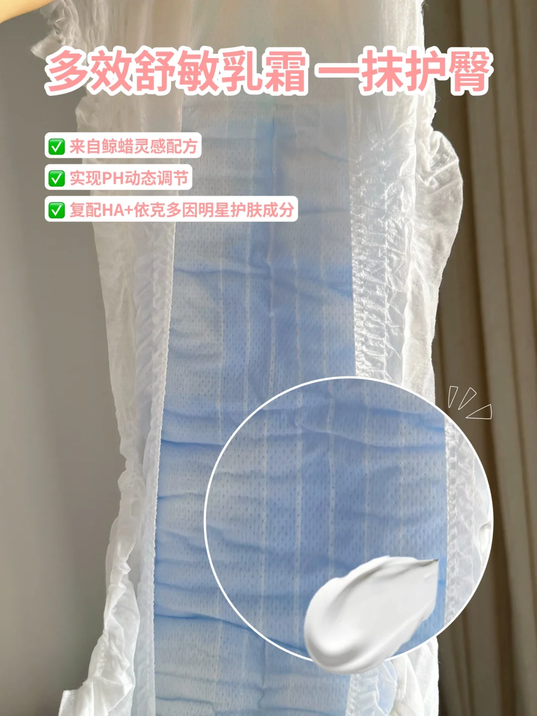 👉另外一个独一无二的点是,纸尿裤添加了舒敏乳霜,一穿就能长效护臀。纸尿裤上有5条看得见的保护线,上面都是满满的乳霜,简直双管齐下!