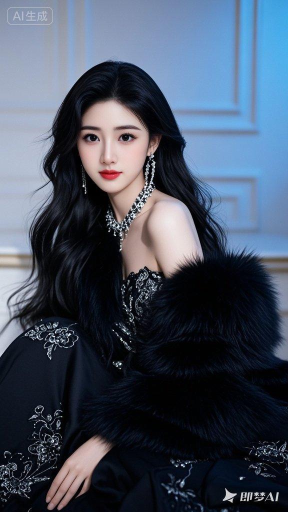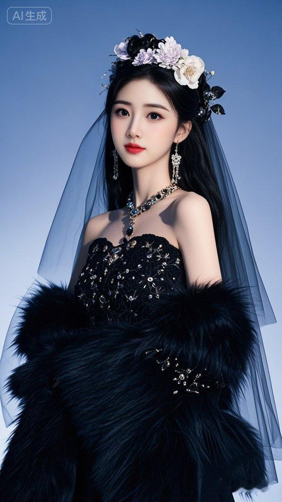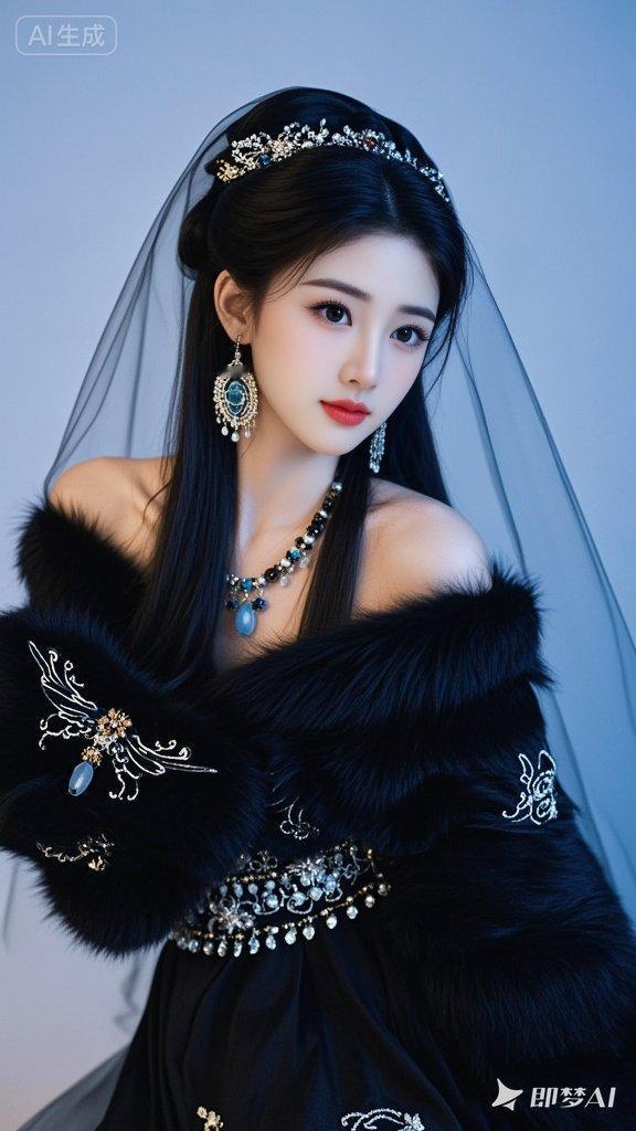 她身着暗黑色毛绒古装,身披璎珞宝石,露肩设计,华丽服饰装扮,她妆容精美,面容姣好,眼神温柔且充满幸福,蓝光照明,婚纱材质细腻,其上有精致的刺绣或装饰,尽显国风之美,长发披肩,戴着大耳环