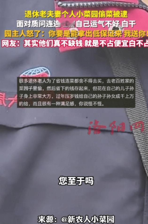 “活不起了!”12月7日,北京,一对退休夫妻溜进菜园,偷摘蔬菜,被圆主发现,面对质问两人不仅毫无愧疚,还吐槽自己运气不好,忙活半天都白费了,圆主愤怒表示要是能拿出低保证就送你们,不用干这么丢人的事!网友:纯属想白嫖! 12 月 7 日北京的天气已经挺冷了,谁能想到这么个大冷天,还有人专门惦记着别人地里的菜,那天上午,经营菜园的大哥跟往常一样去园子里看看,一进园就瞧见俩身影蹲在菜畦边,手里拽着个特大号的袋子,正使劲往里面塞青菜,走近一看是一对头发都花白的夫妻,看着像是退休了的年纪,可干的事却一点都不体面。 大哥心里当时就咯噔一下,这菜是他从开春就伺候着的,天天早起浇水,晚上下班还要来看看有没有虫害,施肥、拔草,哪样都不敢含糊。一片叶子长出来,都得耗上不少心思,本来看着菜长得水灵,心里挺踏实,结果遇上这么档子事,血压瞬间就上来了。 他赶紧上前制止,原以为这俩人被当场撞见,总得有点羞愧,哪怕说句软话也行,可万万没想到,这对夫妻站起身,拍了拍手上的土,脸上一点歉意都没有,反倒你一言我一语地抱怨起来,说自己运气太差,忙活了大半天,最后还是没捞着纯属白干一场。 这话可把大哥气坏了,他看着俩人穿得干干净净,不像是过不下去的样子,本来还想着年纪大了,不想把话说得太绝,可这俩人的态度实在让人忍不了。 大哥压着怒火说这些菜都是他一滴汗一滴汗种出来的,不是地里长出来的免费东西,要是真有难处,好好说不行吗?他当场就表态要是俩人能拿出低保证明,证明是真的活不起了,这些菜他直接送,根本不用干这种偷鸡摸狗的丢人事! 这话一出口俩夫妻没再接话,可那神情还是透着不甘心,好像觉得自己没偷成是吃了大亏,大哥后来越想越气,他种菜园本来就是图个踏实,没想到自己的心血反倒成了别人惦记的 “免费午餐”。 其实说句实在的,现在谁家还缺那点买菜的钱啊?退休夫妻一般都有退休金,日子不说多富裕,肯定不至于到活不起的地步,他们带那么大的袋子,明显是有备而来,就是想着趁人不注意,把别人的劳动成果占为己有,被抓住了不认错,还抱怨运气不好,这心态真是让人没法理解。 网友们知道这事儿后,也都挺气愤,都说这根本不是穷是心穷,要是真的生活困难,好好跟园主说,人家大哥看着实在难肯定会帮忙,毕竟谁都有遇到难处的时候,可这俩人偏要选偷的方式,还觉得理所当然,说白了就是想白嫖,觉得别人的东西不拿白不拿。 退休了本该安享晚年,图个体面,可这俩人却为了点青菜,把自己的脸面都丢了。他们可能觉得这事儿不大,可偷东西就是偷东西,不管价值多少都是损人利己的事,园主愿意给真正有困难的人送菜,是善良,可这份善良不是用来让别人占便宜的。 这事儿说大不大,说小也不小,它说白了就是有些人心里的贪婪在作祟,园主的那句话说得好,真活不起有低保证可以送,可别干这种丢人的事,希望更多人能明白,贫穷从来都不是偷东西的借口,真正让人看不起的,是那种总想不劳而获、占别人便宜的 “心穷”。 (信息来源:零度时评——退休老人菜园偷菜被抓 种植户回应称其拒不赔偿 律师:偷窃不是小事 建议直接报警)