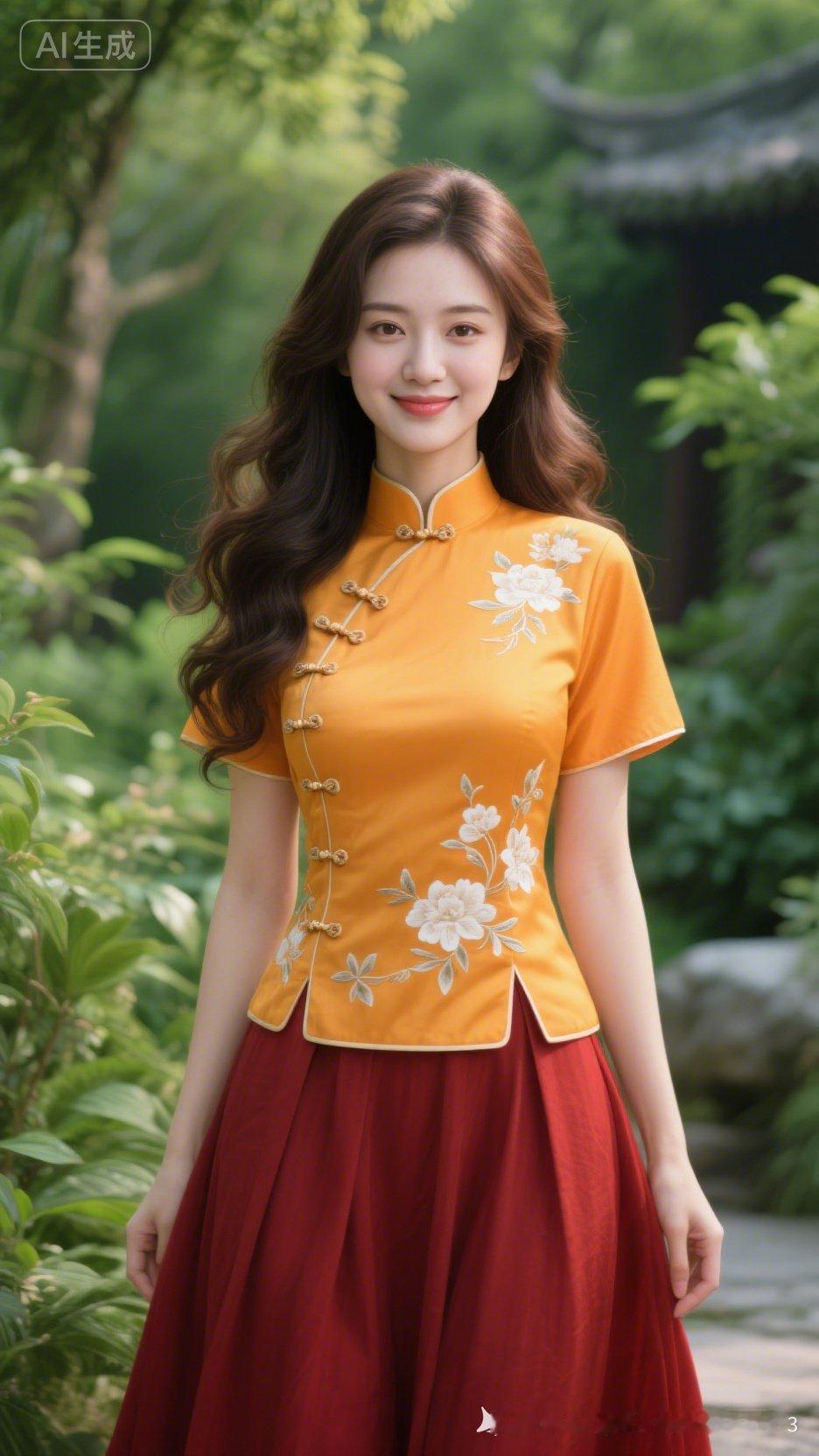 这位长发微卷的美女亭亭玉立于绿意之间,嫣然浅笑。橙黄短衫上白花刺绣与盘扣雅致,暗红裙摆随风轻扬。发丝流转光泽,身姿曼妙,古典韵味与自然生机在她身上完美交融,亲切而迷人。