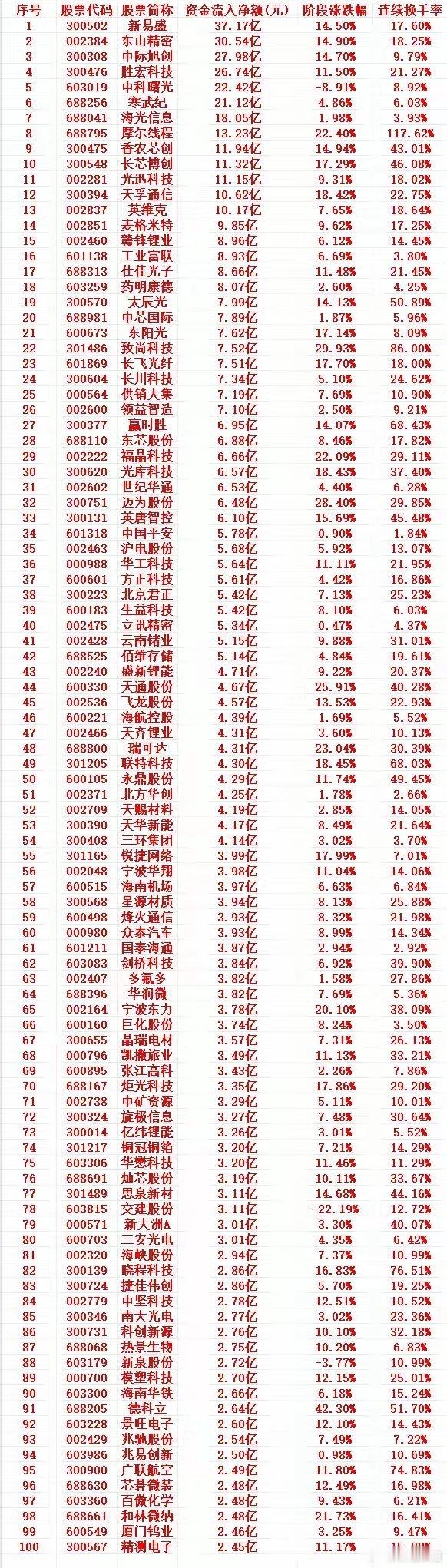 12月10日(周三)主力资金低位大幅加仓个股TOP15排名 股票代码 股票名称 主力净流入额 阶段涨跌幅 换手率 1 300502 新易盛 37.17亿元 14.50% 17.60% 2 002384 东山精密 30.54亿元 14.90% 18.25% 3 300308 中际旭创 27.98亿元 14.70% 9.79% 4 300476 胜宏科技 26.74亿元 11.50% 21.27% 5 603019 中科曙光 22.42亿元 -8.91% 8.92% 6 688256 寒武纪 21.12亿元 4.86% 6.03% 7 688041 海光信息 18.05亿元 1.98% 3.93% 8 688795 摩尔线程 13.23亿元 22.40% 117.62% 9 300475 香农芯创 11.94亿元 14.94% 43.01% 10 300548 长芯博创 11.32亿元 17.29% 46.08% 11 002281 光迅科技 11.15亿元 9.31% 18.02% 12 300394 天孚通信 10.62亿元 18.42% 22.75% 13 002837 英维克 10.17亿元 7.65% 18.64% 14 002851 麦格米特 9.85亿元 9.62% 17.25% 15 002460 赣锋锂业 8.96亿元 6.12% 14.45% 主力资金流入核心特征1. 资金集中度凸显:前十大标的主力净流入额均突破10亿元,新易盛以37.17亿元的净流入规模位居榜首,头部个股吸金效应显著。2. 行业布局方向明确:资金主攻赛道清晰,重点聚焦光通信(新易盛、中际旭创、光迅科技)、半导体/AI(寒武纪、海光信息)、新能源(赣锋锂业)及高端制造等核心领域。3. 资金认可度较高:超90%的上榜个股主力净流入净额为正,场内资金对这批标的的布局意愿强烈,整体关注度处于高位。资金流入与股价联动分析1. 正向联动为主流:多数个股呈现“资金流入+股价上涨”的同步走势,其中30只标的阶段涨幅超10%,致尚科技、迈为股份、德科立等个股涨幅居前,资金助推作用明显。2. 存在逆势吸筹案例:有3只个股出现“资金流入但股价下跌”的情况,分别是中科曙光(-8.91%)、交建股份(-22.19%)、新泉股份(-3.77%),这类异动或受行业周期调整、业绩预期分歧等因素影响。3. 长期布局特征显现:工业富联、中国平安等标的呈现“低涨幅+高资金流入”的特点,资金介入逻辑偏向中长期价值布局,短期股价并未出现明显异动。换手率折射交易热度1. 高换手标的交易活跃:超20只个股连续换手率超20%,摩尔线程、致尚科技、晓程科技换手率尤为突出,分别达到117.62%、86.00%、76.51%,反映出短期资金博弈激烈,交易热度拉满。2. 低换手标的偏向稳健:中国平安(1.84%)、北方华创(2.66%)等标的换手率较低,这类个股多为权重股或机构重仓标的,资金流入以稳健型布局为主,筹码稳定性更强。