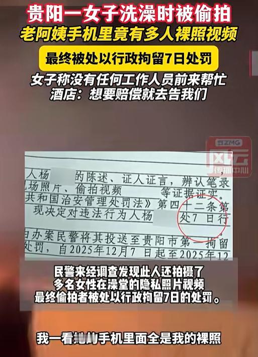 贵州,熊女士去外面洗澡,却在淋浴区,发现一位老年女子偷拍自己,且正准备发送。熊女士立即上前抢夺手机,双方随即发生了争执。经过争夺,熊女士成功拿到手机,发现手机里不仅有她的隐私照,还有其他女性的隐私照,她果断选择了报警。 事发当天,熊女士一家四口乐呵呵去水汇放松,蒸完汗蒸就去淋浴区冲澡。她手一滑,水花溅到旁边大妈身上,熊女士赶紧转身道歉,可这一转身,魂儿都快吓飞了 —— 大妈手里举着手机,正对着她拍摄! 隐私哪能让人这么糟践?熊女士立马冲上去抢手机。大妈攥得死死的,俩人当场扭打起来。更让她揪心的是,身边还带着孩子,一边要把孩子护在身后,一边要跟偷拍者掰扯,足足十来分钟,都没有工作人员帮忙。 最后熊女士拼着劲抢回手机,民警赶来把大妈带走,一查手机吓了一跳 —— 里面不光有熊女士的隐私照,还有一大堆不同女性的澡堂照、视频,甚至有不少视频,已经被大妈传播出去了。 证据摆面前,大妈没的狡辩,被处 7 天行政拘留。可熊女士越想越窝火,水汇从头到尾没个正经说法。经理透露,他们的 “解决方案” 是:免掉当天一家四口的门票,再送三张门票。 熊女士要经济补偿,他们直接拒绝,说 “没法同意”。而且直接让熊女士走法律程序,法院判多少我们赔多少。” 这态度,把熊女士失望得透透的,当场就说要维权到底。 有网友说:“偷拍者缺德,水汇更无耻!门票能换回被泄露的隐私吗? 骂归骂,这事儿越琢磨越不对劲:我们去消费场所花钱,图的就是个安全放心,遇到危险时商家不管不顾,事后还敷衍了事,这责任真能赖掉吗? 老话说 “拿人钱财,与人消灾”,从法律上讲,《消费者权益保护法》第 18 条明明白白写着:经营者应当保障消费者的人身、财产安全。水汇作为密闭私密的消费场所,对顾客的隐私和安全有更高的保障义务 —— 不光要巡场,遇到冲突还得及时制止、提供帮助。 熊女士遭遇偷拍时,工作人员不及时劝阻,这已经违反了安全保障义务。更过分的是,事后不道歉、不整改,反倒想用几张门票蒙混过关,把消费者的隐私和安全当儿戏。 偷拍者被拘留是罪有应得,但水汇的管理漏洞和工作人员的失职,才是让消费者寒心的根源 —— 如果当时有人上前帮忙,熊女士也不用又护孩子又抢手机,受那么大惊吓。 也给咱们普通人提了个醒:遇到这种事别忍气吞声,商家敷衍了事时,该找媒体就找媒体,该走法律程序就走法律程序。只有让商家知道 “失职要付出代价”,他们才会把消费者的安全和隐私放在心上。 毕竟,谁也不想花钱买罪受,更不想在本该放松的地方,遭遇隐私被侵犯、求助无门的糟心事儿。 你们对此事怎么看?