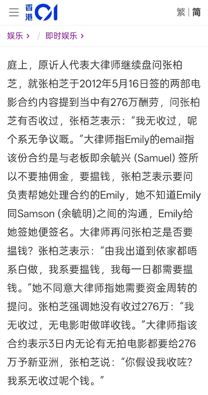 张柏芝助手否认故意让手机掉厕所 估计庭 审 法 官也挺无语的。。。余毓兴这边口口声声要告张柏芝,结果自家律师连合约都不看?合约写得清楚,期内不拍摄电影也要支付全部款项,也就是说其实现在是余还倒 欠张柏芝1380万。。。电影剧本都没给到艺人就想以此纯 讹一笔,跳梁小丑一样自己打自己的脸,张柏芝这把也是碰上神 人了。。。