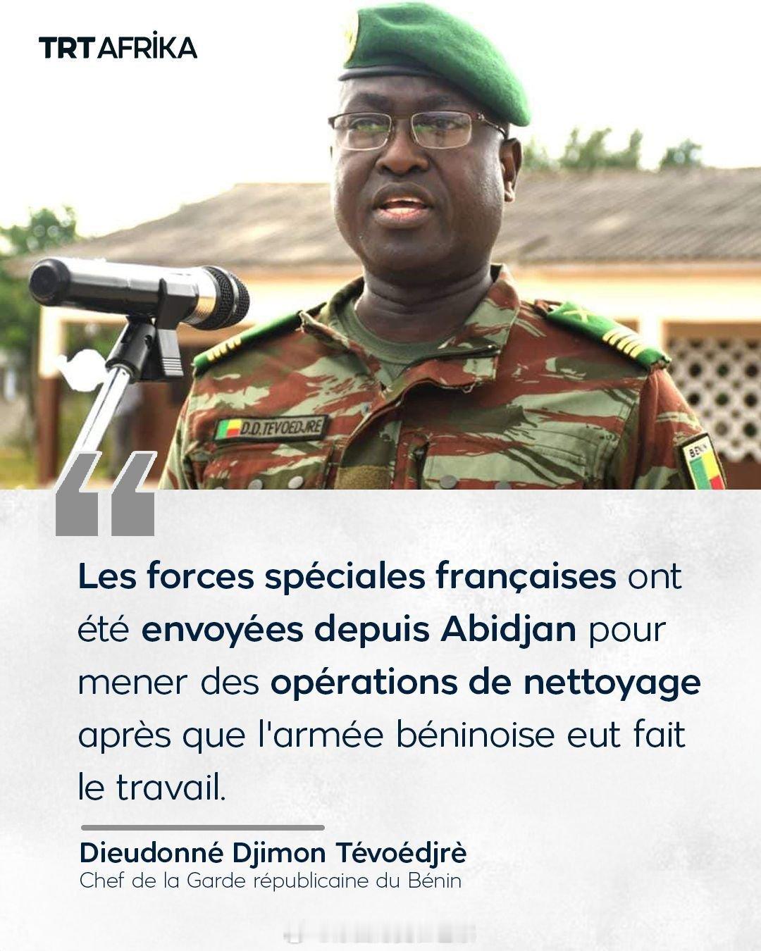 贝宁政变未逐 应贝宁政府要求,巴黎方面提供了“监视”和“后勤”支持,以应对涉嫌政变者,据法国总统府爱丽舍宫称。贝宁共和卫队(Garde républicaine)负责人 — Dieudonné Djimon Tévoédjrè 上校— 向法新社表示,那天“贝宁军队英勇奋战,整整一天与敌人交锋”。他补充道,“法国特种部队于周日从阿比让出发,被派遣来该国执行‘清剿’行动——是在贝宁军队完成主要任务之后。”贝宁部分军人发动政变海外新鲜事
