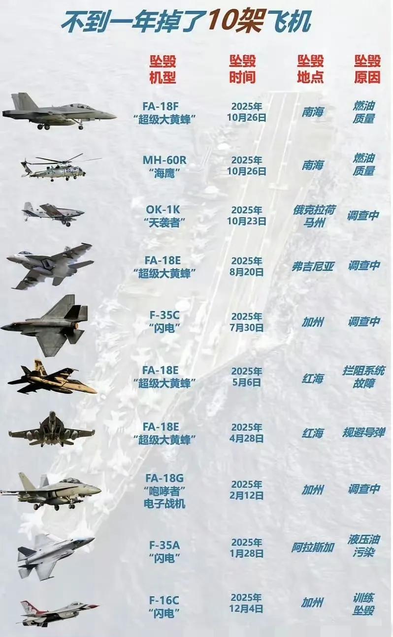 新晋摔机王来了,恭喜老美实力上榜,一年时间不到掉了10架战机,四代主力战机掉个遍不说,五代机也难以幸免,就差F22了。 三哥见此终于可以释怀了,你老美还没打战就掉这么多,有什么资格笑话我被小巴干掉七架战机,我好歹是在打战啊!